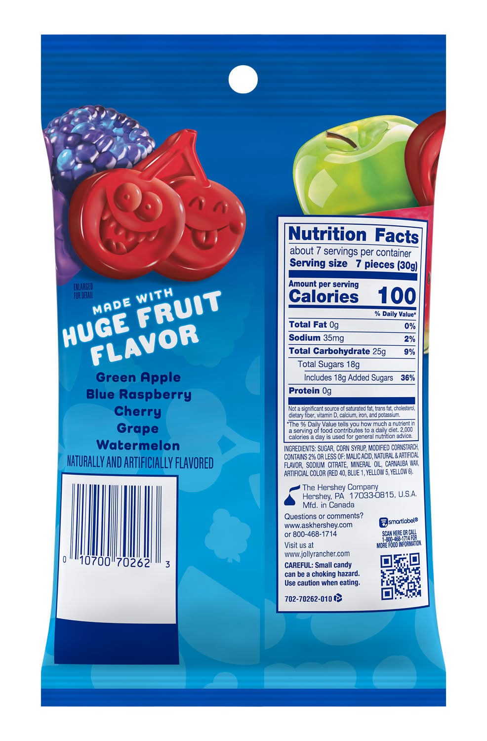 A mix of five fruity favorites for the whole family in just one bag of chewy gummies? You wouldn't have thought it possible if you didn't know JOLLY RANCHER candy. This bag of fruit flavored gummies offers fun, flavorful fruit shapes each member of the family will be happy to choose from. Featuring blue raspberry, green apple, cherry, grape and watermelon flavors, JOLLY RANCHER gummies offer a combination of the undisputed original flavor classics you know and love. Keep a bag with you on the go so you can share with friends, co-workers or family members throughout the day — but don't forget to save some gummies for yourself during all that sharing! These fruit flavored candies make the perfect covered candy bowl display all year thanks to vibrant colors and attractive JOLLY RANCHER fruit shapes. They're also great treats for stuffing festive Christmas stockings, filling springtime Easter baskets and plastic eggs, creating Valentine's Day gift bags and filling Halloween party favors. Whether you're celebrating a major holiday or an ordinary day, JOLLY RANCHER gummies candies make every moment a little more fun. If you want a small candy with a big taste to keep your taste buds busy during movie nights, lunch hours and snack breaks, JOLLY RANCHER chewy gummies are the treat for you. Flavor: Assorted