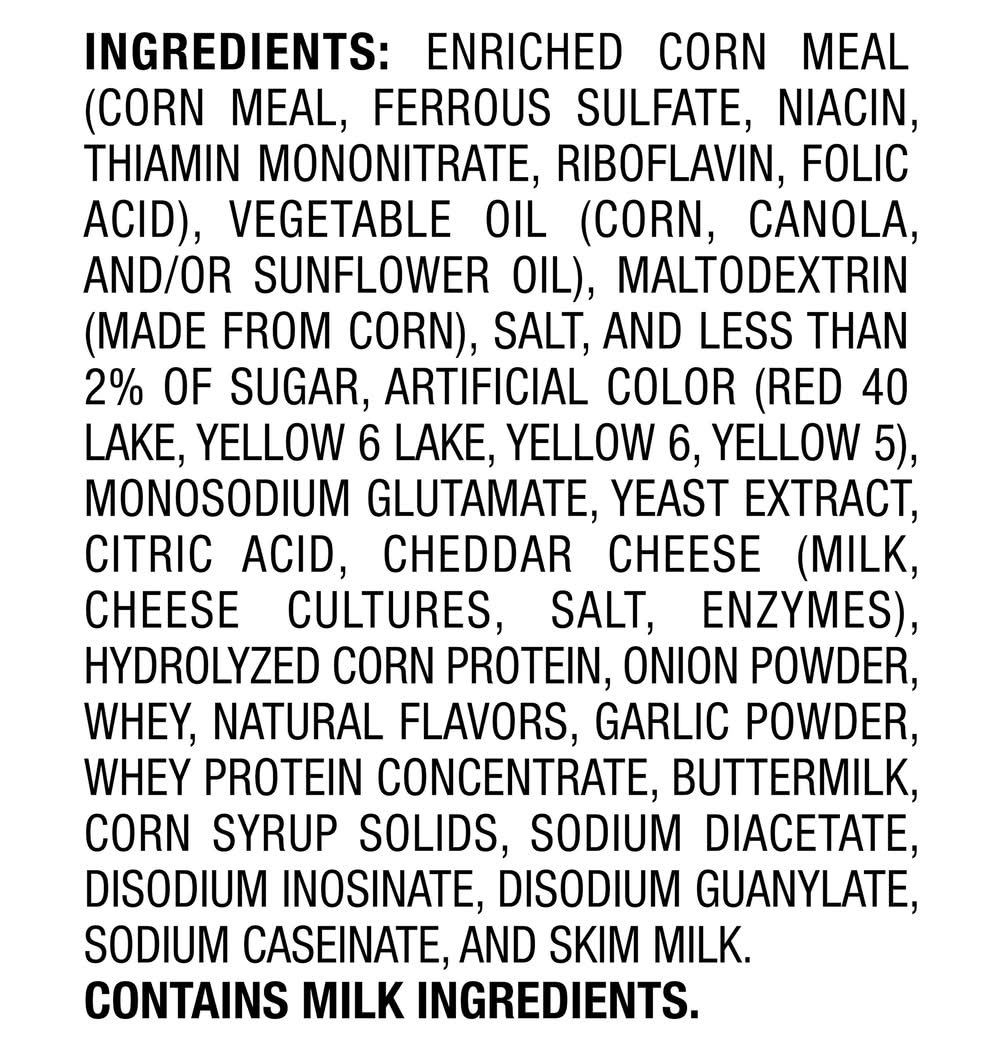 Ingredients: Enriched Corn Meal (Corn Meal, Ferrous Sulfate, Niacin, Thiamin Mononitrate, Riboflavin, Folic Acid), Vegetable Oil (Corn, Canola, and/or Sunflower Oil), Maltodextrin (Made from Corn), Salt, and Less than of Sugar, Artificial Color (Red 40 Lake, Yellow 6 Lake, Yellow 6, Yellow 5), Monosodium Glutamate, Yeast Extract, Citric Acid, Cheddar Cheese (Milk, Cheese Cultures, Salt, Enzymes), Hydrolyzed Corn Protein, Onion Powder, Whey, Natural Flavors, Garlic Powder, Whey Protein Concentrate, Buttermilk, Corn Syrup Solids, Sodium Diacetate, Disodium Inosinate, Disodium Guanylate, Sodium Caseinate, and Skim Milk Contains: Milk, Corn