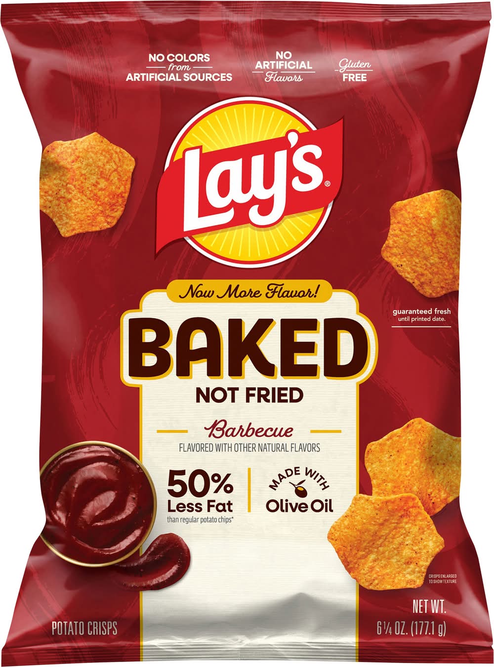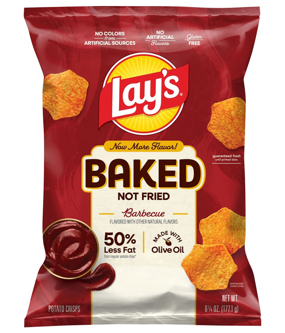 The line of Oven Baked snacks are baked, not fried, to give you the great taste you've come to love with Frito-Lay snacks. On top of that • Flavor: Barbecue • Frito-Lay, Inc., Plano,TX,75024-4099