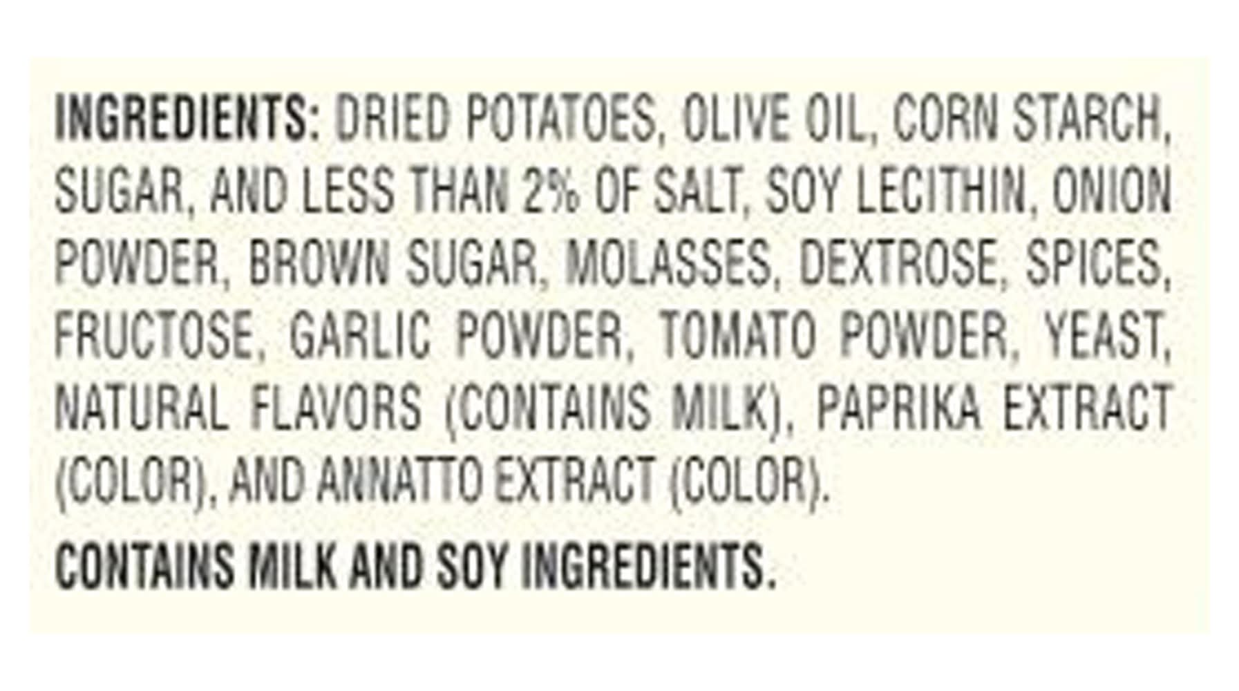 Ingredients: Dried Potatoes, Corn Starch, Corn Oil, Sugar, Salt, Soy Lecithin, Onion Powder, Maltodextrin (made from Corn), Dextrose, Brown Sugar, Molasses, Spices, Fructose, Tomato Powder, Garlic Powder, Yeast, Soybean Oil, Natural Flavors (contains Milk), Sunflower Oil, Paprika, Acacia Gum, Paprika Extracts, Annatto Extracts, Caramel Color Contains: Soybeans, Milk