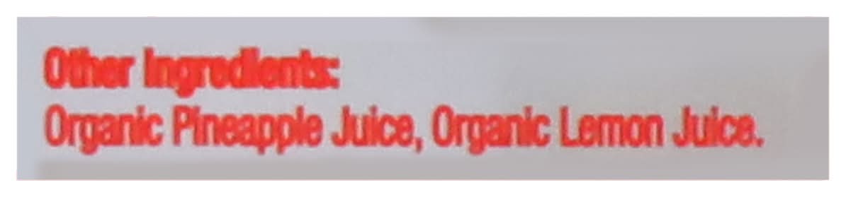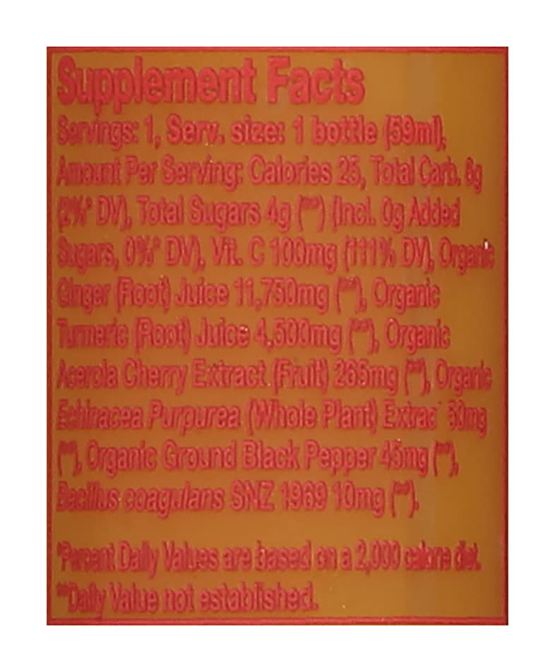 Ingredients: Organic Pineapple Juice, Organic Ginger Root Juice, Organic Turmeric Root Juice, Organic Lemon Juice, Organic Acerola Cherry Extract, Organic Echinacea Purpurea Extract, Organic Ground Black Pepper, Bacillus coagulans SNZ 1969. Contains: Tree Nuts
