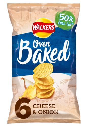 - Delicious baked Walkers crisps with a classic cheese and onion flavouring - Baked for extra crispy crunchiness - Walkers Oven Baked contain 50% less fat than regular potato crisps - Enjoy on-the-go or packed into a lunchbox - Each multipack contains 6 individual packs Brand: Walkers