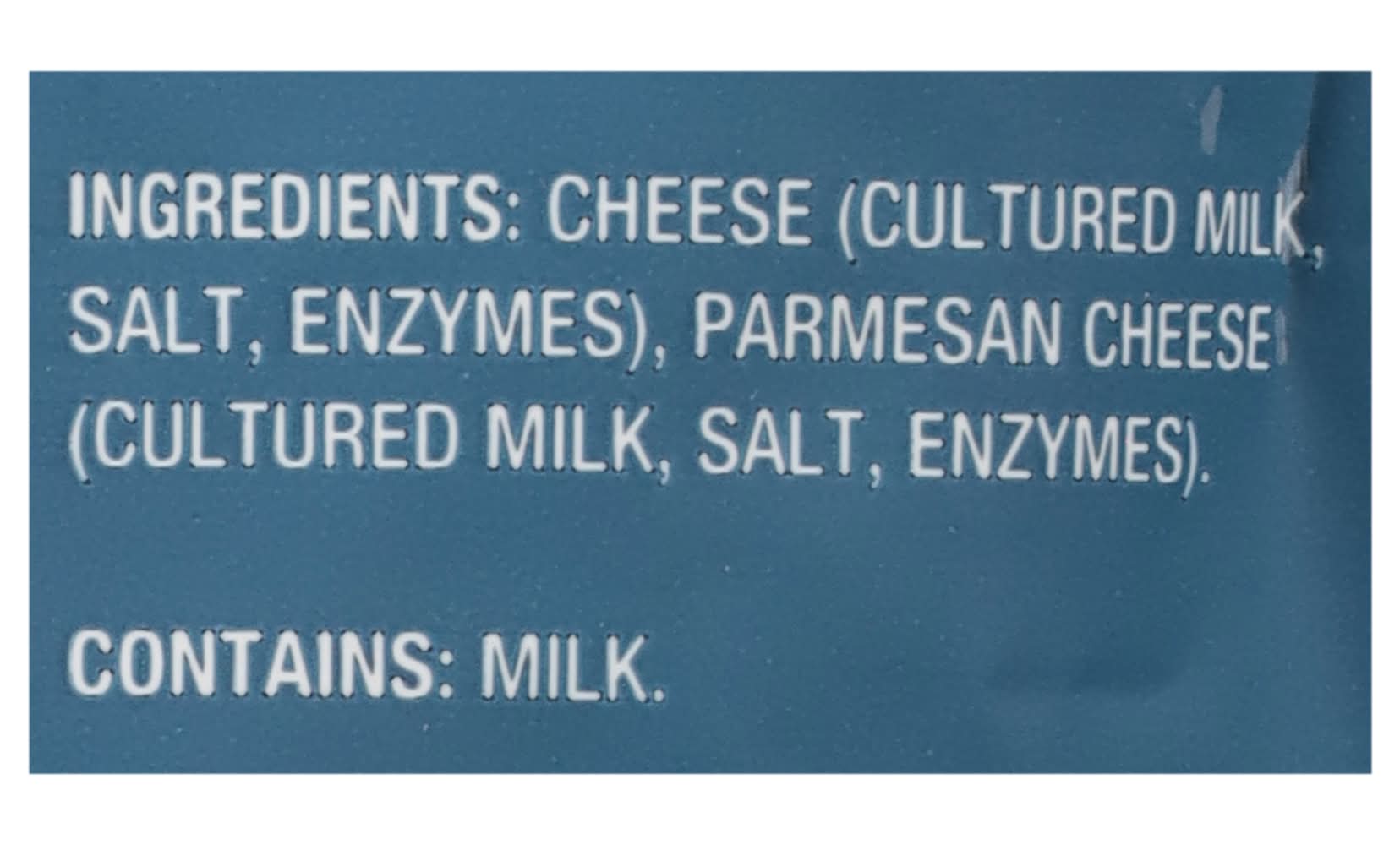 Ingredients: Cheese (Cultured Milk, Salt, Enzymes), Parmesan Cheese (Cultured Milk, Salt, Enzymes) Contains: Milk