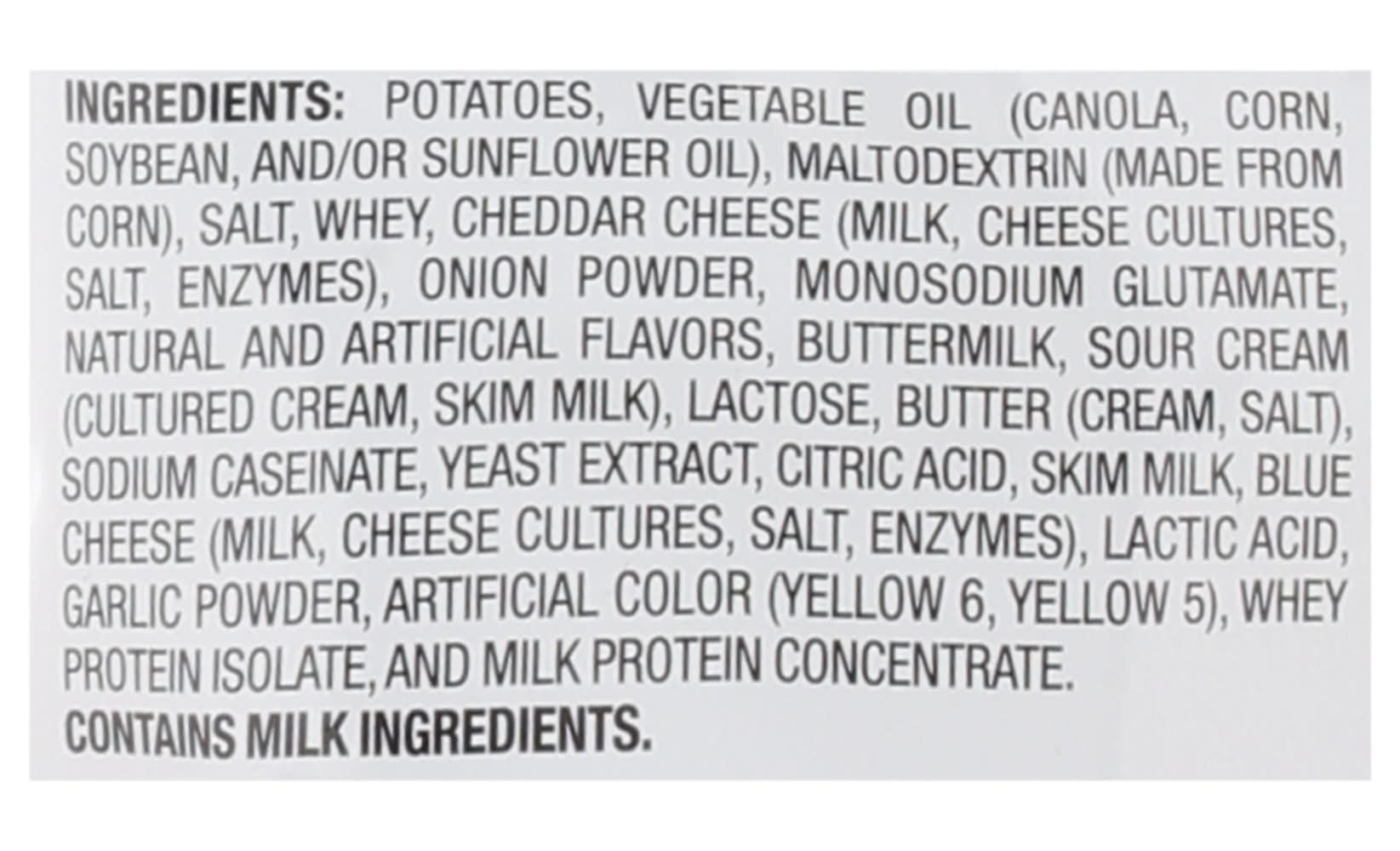 Ingredients: Potatoes, Vegetable Oil (Canola, Corn, Soybean, and/or Sunflower Oil), Maltodextrin (Made from Corn), Salt, Whey, Cheddar Cheese (Milk, Cheese Cultures, Salt, Enzymes), Onion Powder, Monosodium Glutamate, Natural and Artificial Flavors, Buttermilk, Sour Cream (Cultured Cream, Skim Milk), Lactose, Butter (Cream, Salt), Sodium Caseinate, Yeast Extract, Citric Acid, Skim Milk, Blue Cheese (Milk, Cheese Cultures, Salt, Enzymes), Lactic Acid, Garlic Powder, Artificial Color (Yellow 6, Yellow 5), Whey Protein Isolate, and Milk Protein Concentrate Contains: Milk, Lactose, Corn, Soybeans
