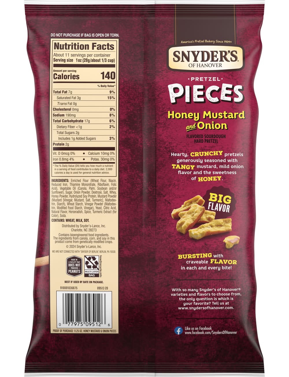 Snyder's of Hanover Honey Mustard and Onion Pretzel Pieces are bursting with big flavor! Enjoy crunchy sourdough pretzels generously seasoned with tangy mustard, mild onion flavor, and the sweetness of honey. You'll love the crunch, hearty satisfaction and bold flavor found in every bite of these Snyder's Pretzel Pieces. You'll love these crunchy pretzel pieces as a lunch snack or while watching your favorite sports game. Snyder's of Hanover has been America's Pretzel Bakery since 1909 and our pretzels give you that delicious crunch for the perfect snack! Made in a facility that does not process peanuts, Snyder's pretzels are made from wholesome ingredients, kneaded, and oven-baked to seal in all the flavor. Snyder's of Hanover pretzels have been shared across tables, across generations and across the country, making us America's favorite pretzel brand. • Snyder's-Lance, Inc., Charlotte, NC. • Packaging: Reusable