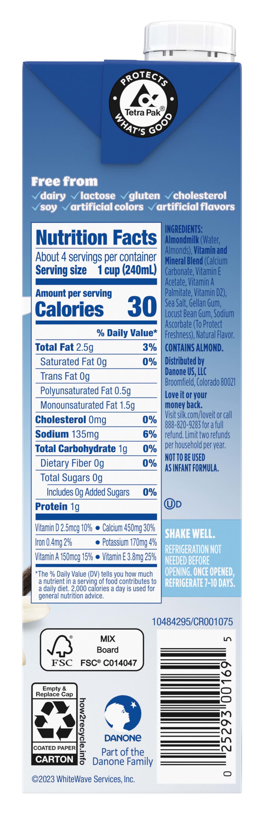 Bring the creamy goodness of almondmilk to your pantry with Silk Shelf-Stable Unsweetened Vanilla Almondmilk. Featuring a delicate vanilla taste and just 30 calories per serving, this unsweetened almondmilk is delicious whether it’s poured over cereal, added to your favorite recipes, or enjoyed straight out of the glass. It makes a perfect non-dairy alternative to milk, and is totally free of dairy, soy, lactose, gluten, casein, egg, and MSG. Silk Almondmilk provides vitamin E and contains 50% more calcium than dairy milk.* And since it comes in special, shelf-stable packaging, this unsweetened vanilla nutmilk will keep fresh at room temperature, unopened, until the date code: no refrigeration necessary! *Silk Unsweetened Vanilla Almondmilk: 450mg of calcium per cup; reduced fat dairy milk: 293mg of calcium per cup. USDA National Nutrient Database for Standard Reference. Data consistent with typical reduced fat dairy milk. • Danone US, Broomfield,CO,80021 • Packaging: Reusable