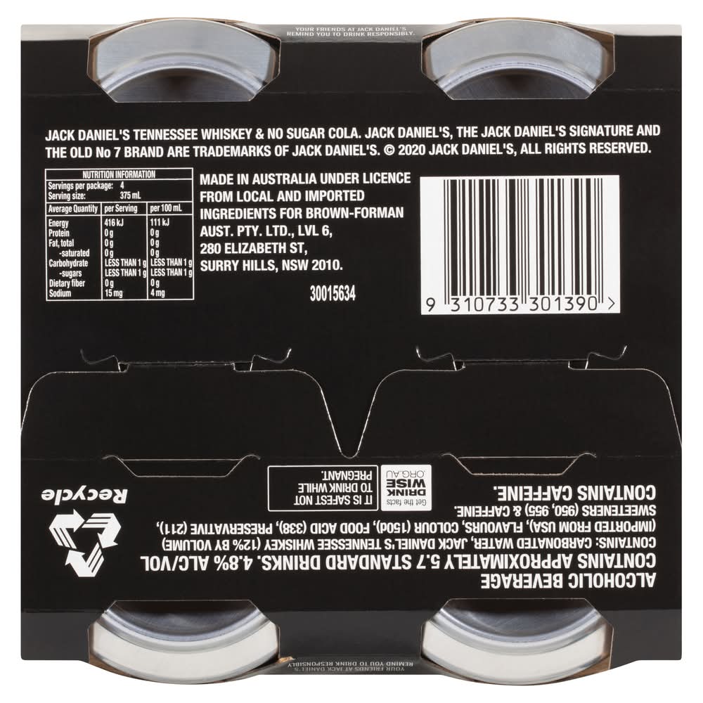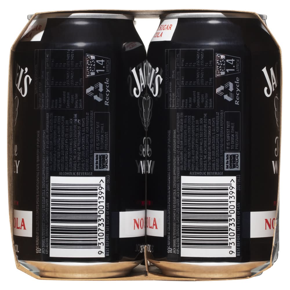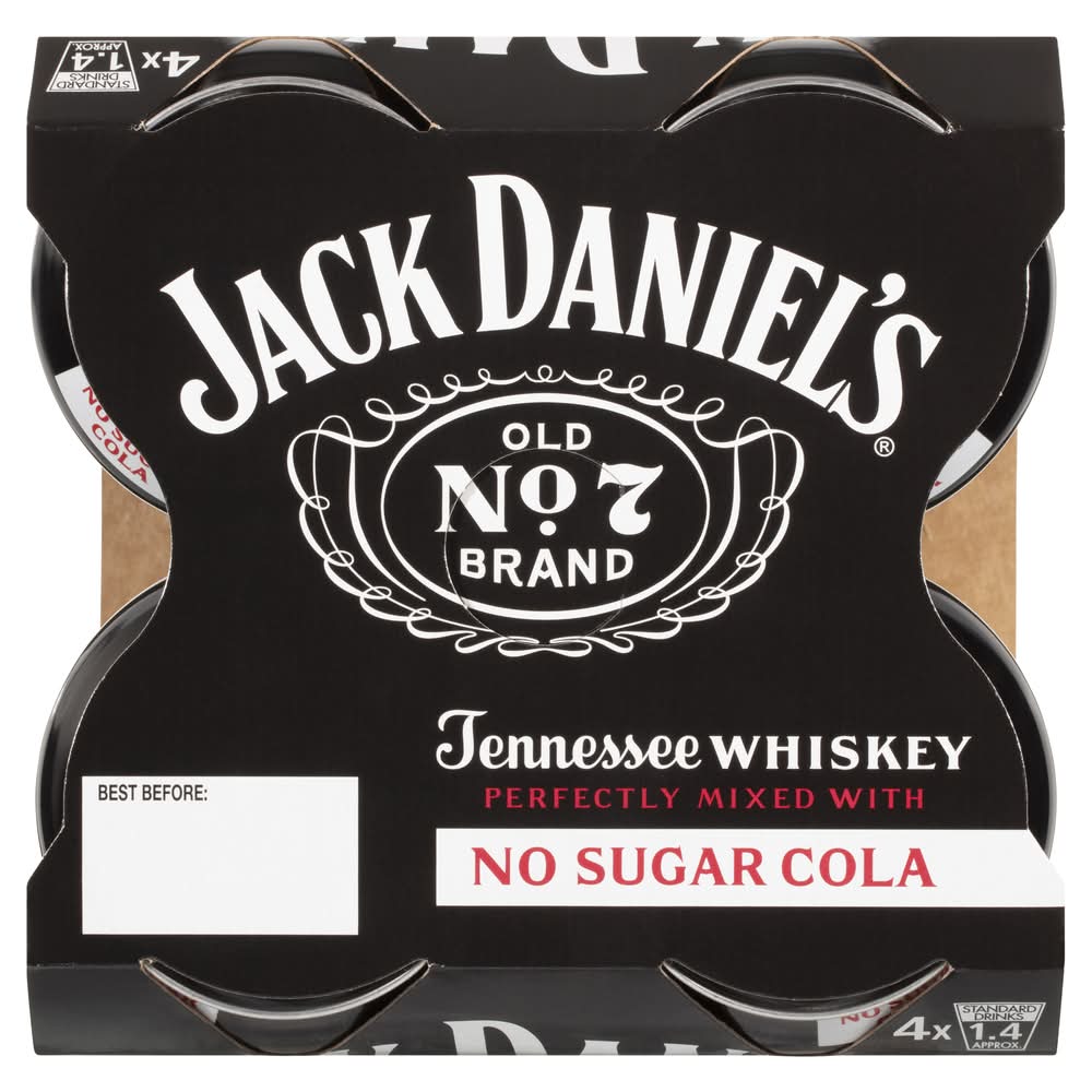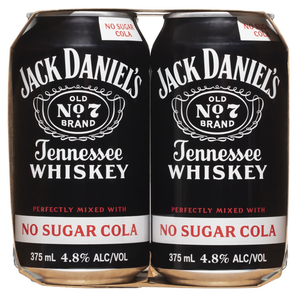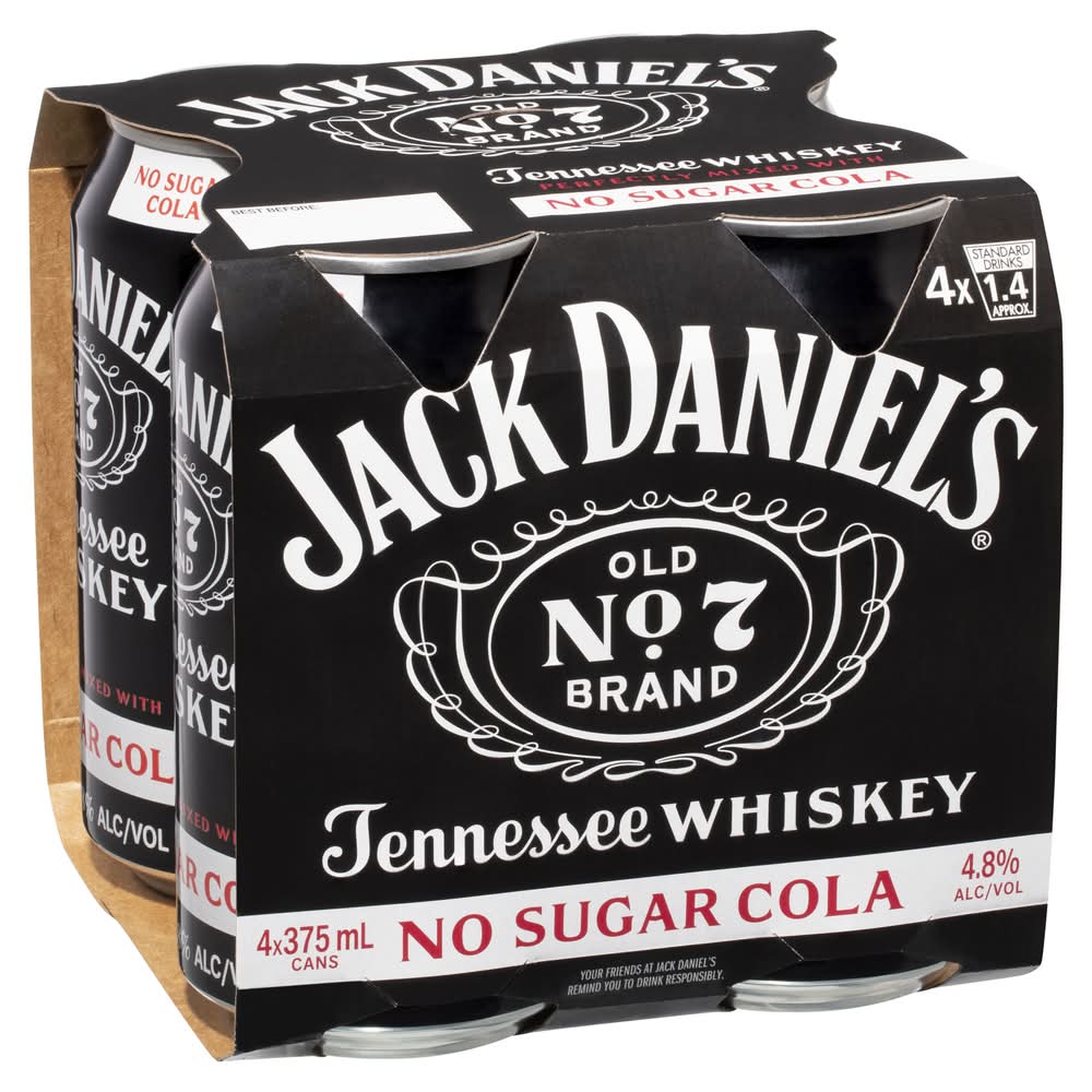 charcoal mellowed drop by drop, giving our whiskey its unique flavor. Enjoy it perfectly mixed with no sugar cola. • Pack size: 4 • Alcohol by volume: 4.8% • Packaging: Reusable