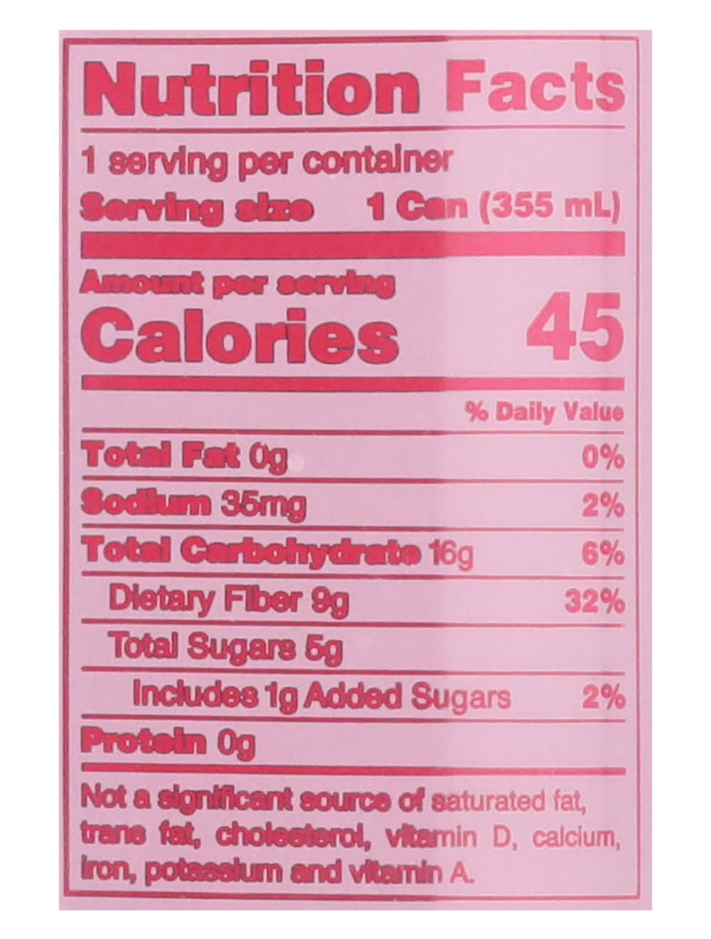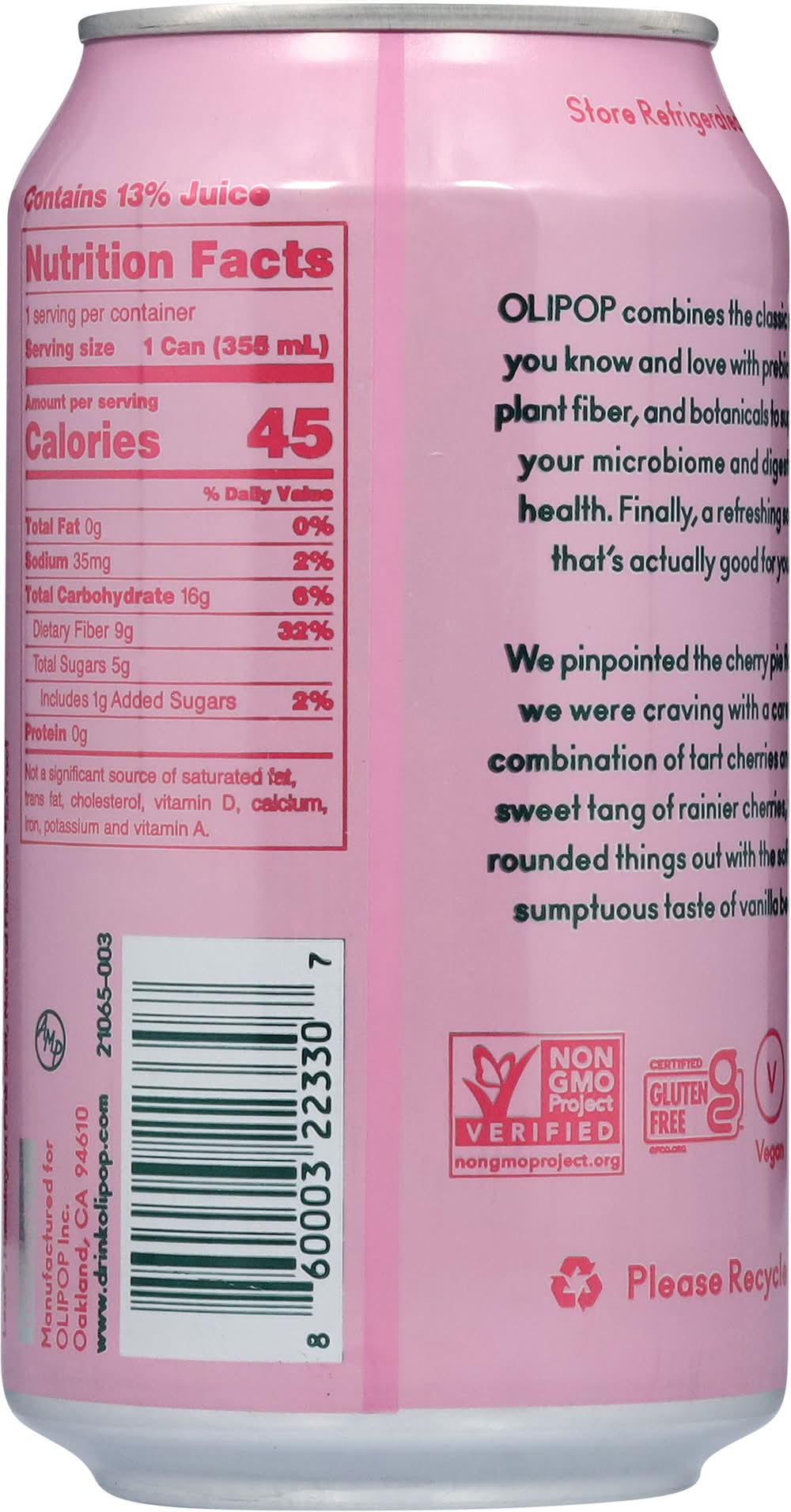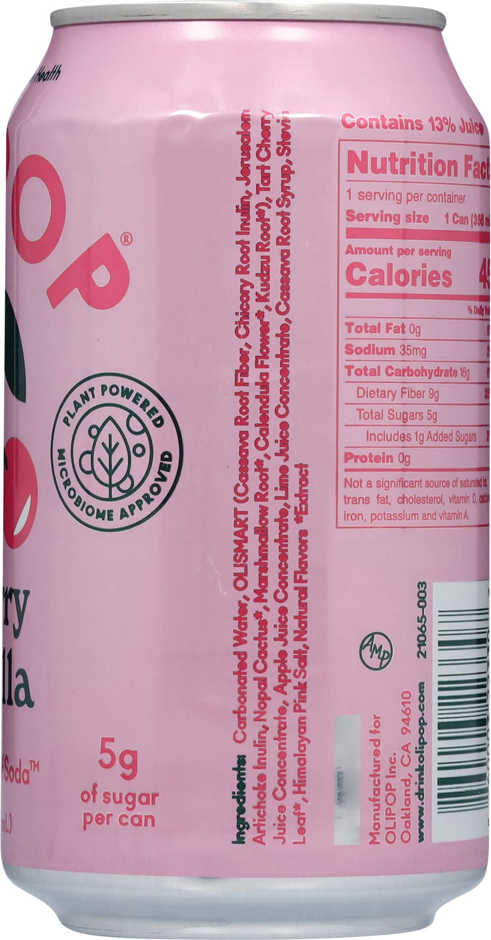 Ingredients: Carbonated Water, Olismart (Cassava Root Fiber, Chicory Root Inulin, Jerusalem Artichoke Inulin, Nopal Cactus*, Marshmallow Root*, Calendula Flower*, Kudzu Root*), Tart Cherry Juice Concentrate, Cassava Root Syrup, Apple Juice Concentrate, Lime Juice, Stevia Leaf*, Himalayan Pink Salt, Natural White Cherry Flavor, Natural Vanilla Flavor. * Extract