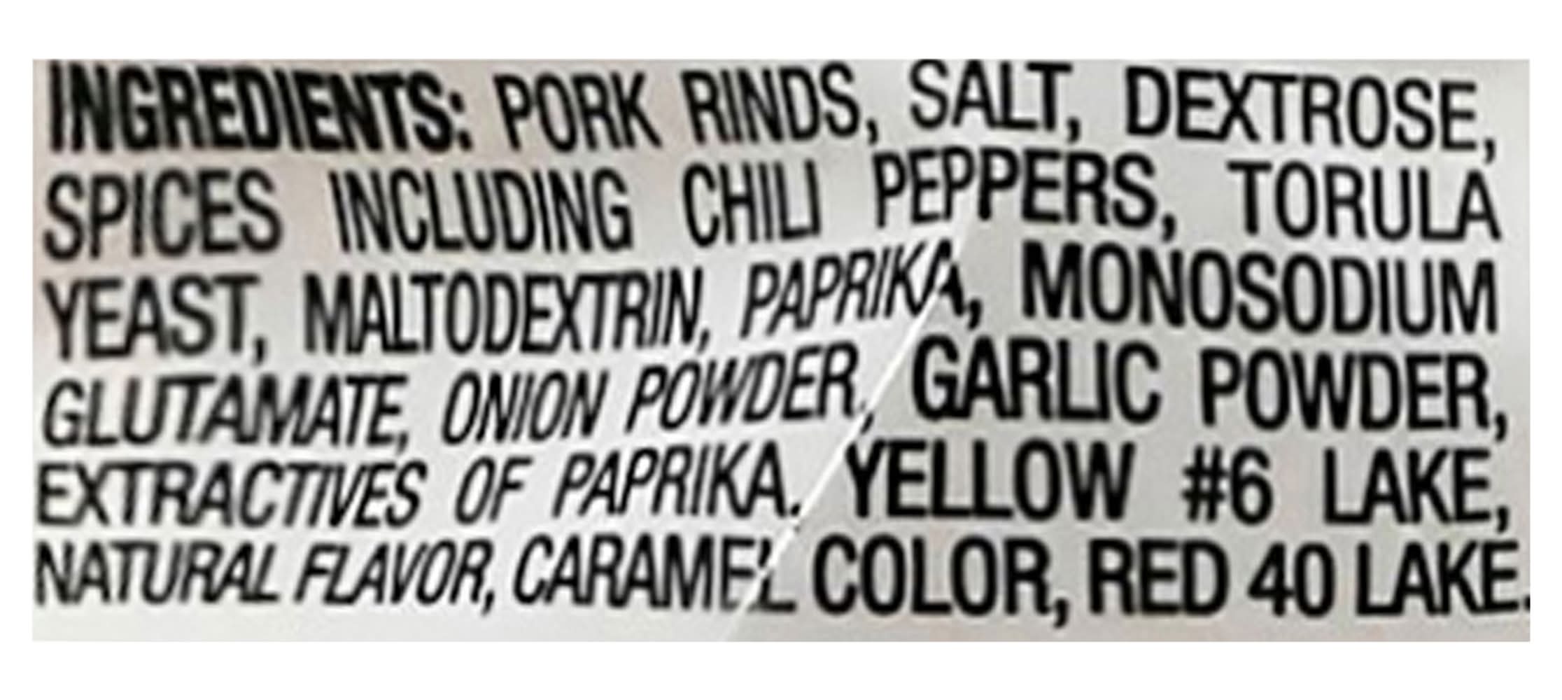 Ingredients: Pork Rinds, Salt, Dextrose, Spices Including Chili Peppers, Torula Yeast, Maltodextrin, Paprika, Monosodium Glutamate, Onion Powder, Garlic Powder, Extractives of Paprika, Yellow #6 Lake, Natural Flavor, Caramel Color, Red 40 Lake