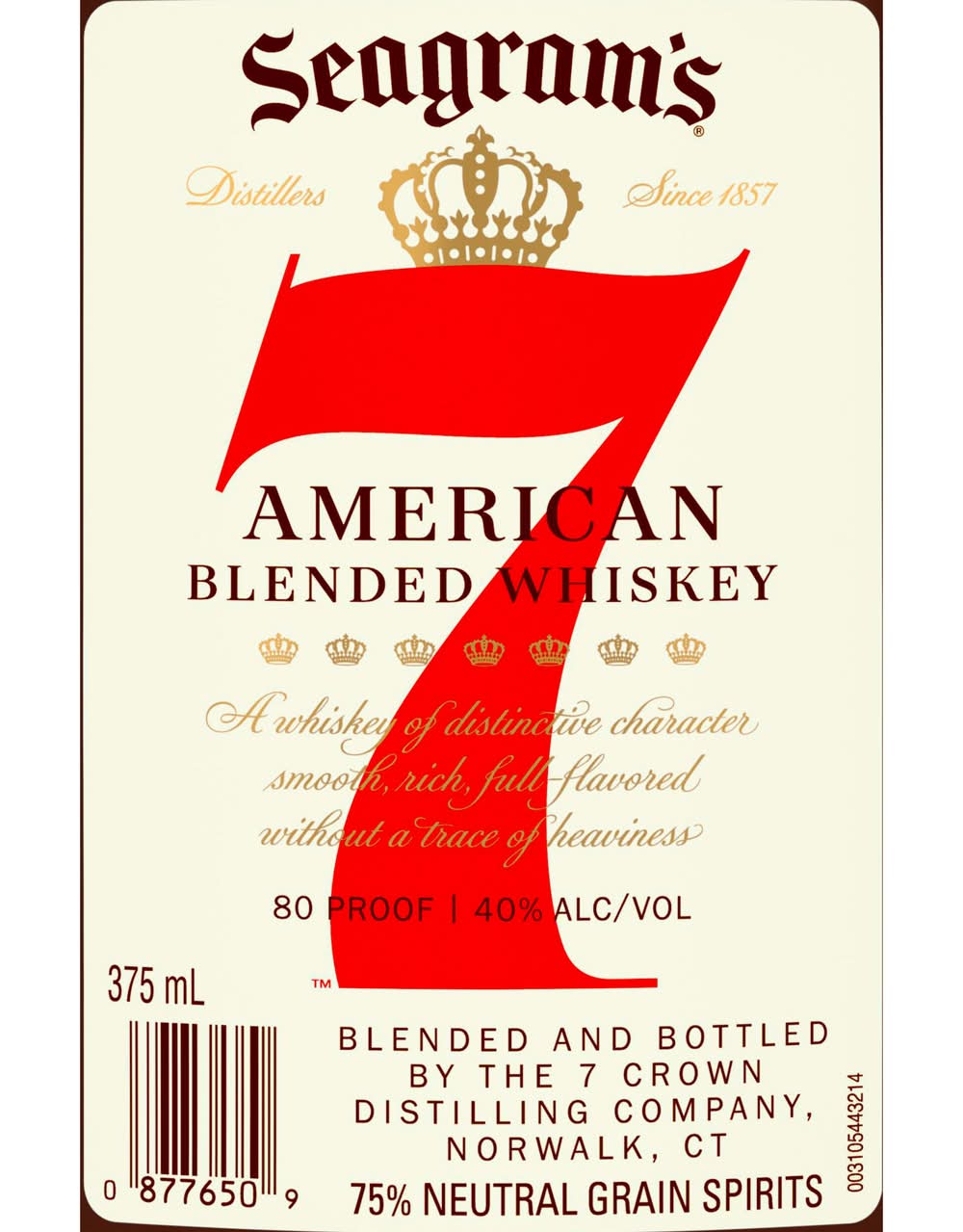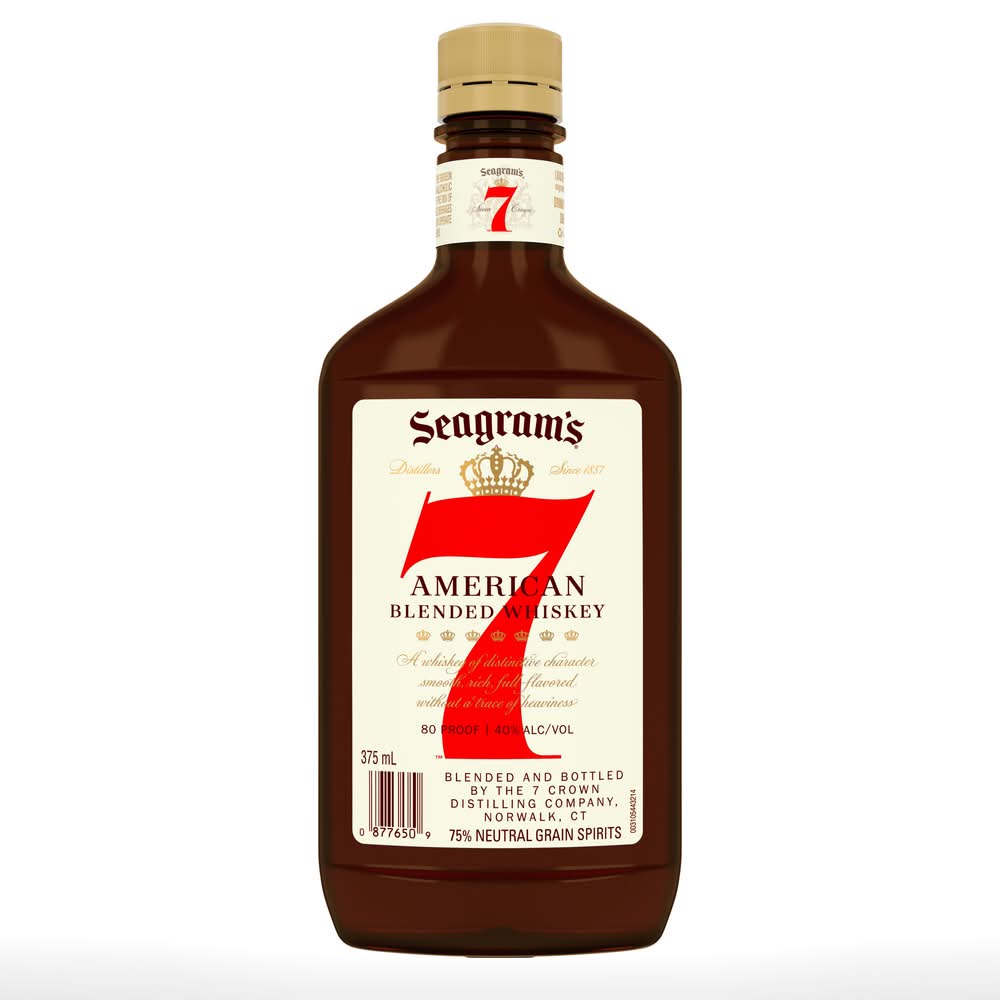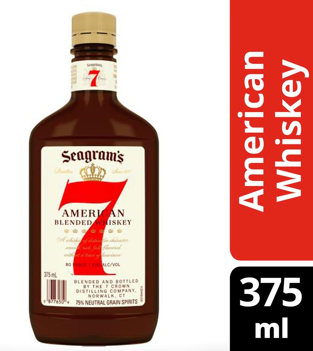 Put your feet up, relax and let the crisp aroma of Seagram's 7 Crown American Blended Whiskey envelop you. Our aged whiskey has a smooth, slightly sweet taste that leaves your palate with a creamy, vanilla finish. Our whiskey blend contains 40 percent alcohol by volume and is carefully blended and aged in oak barrels to bring out its bold flavors. Perfect for a signature 7 & 7 cocktail. Includes one 80 proof 375 mL bottle of Seagram's American Blended Whiskey. Please drink responsibly. • Brand: Seagram's escapes • Alcohol by volume: 40% • 7 Crown Distilling, Norwalk, CT.