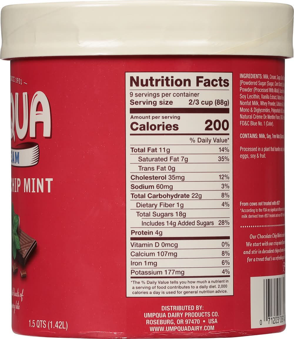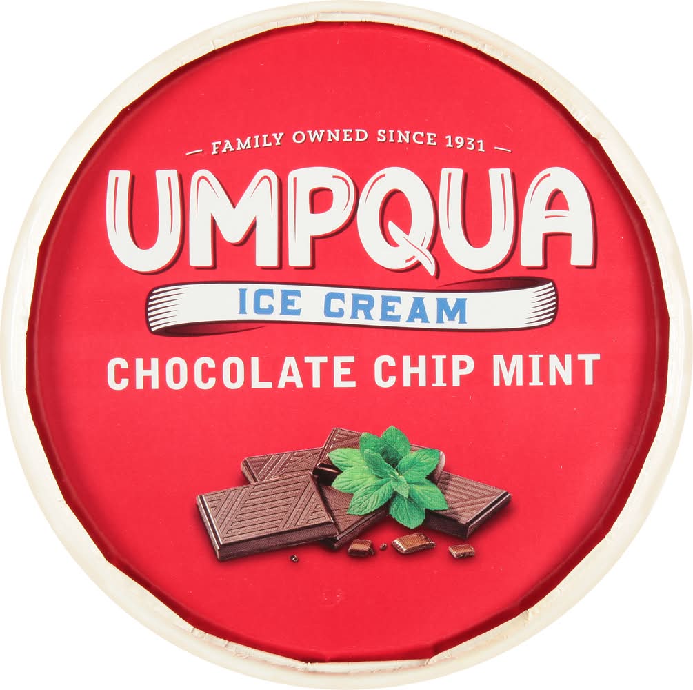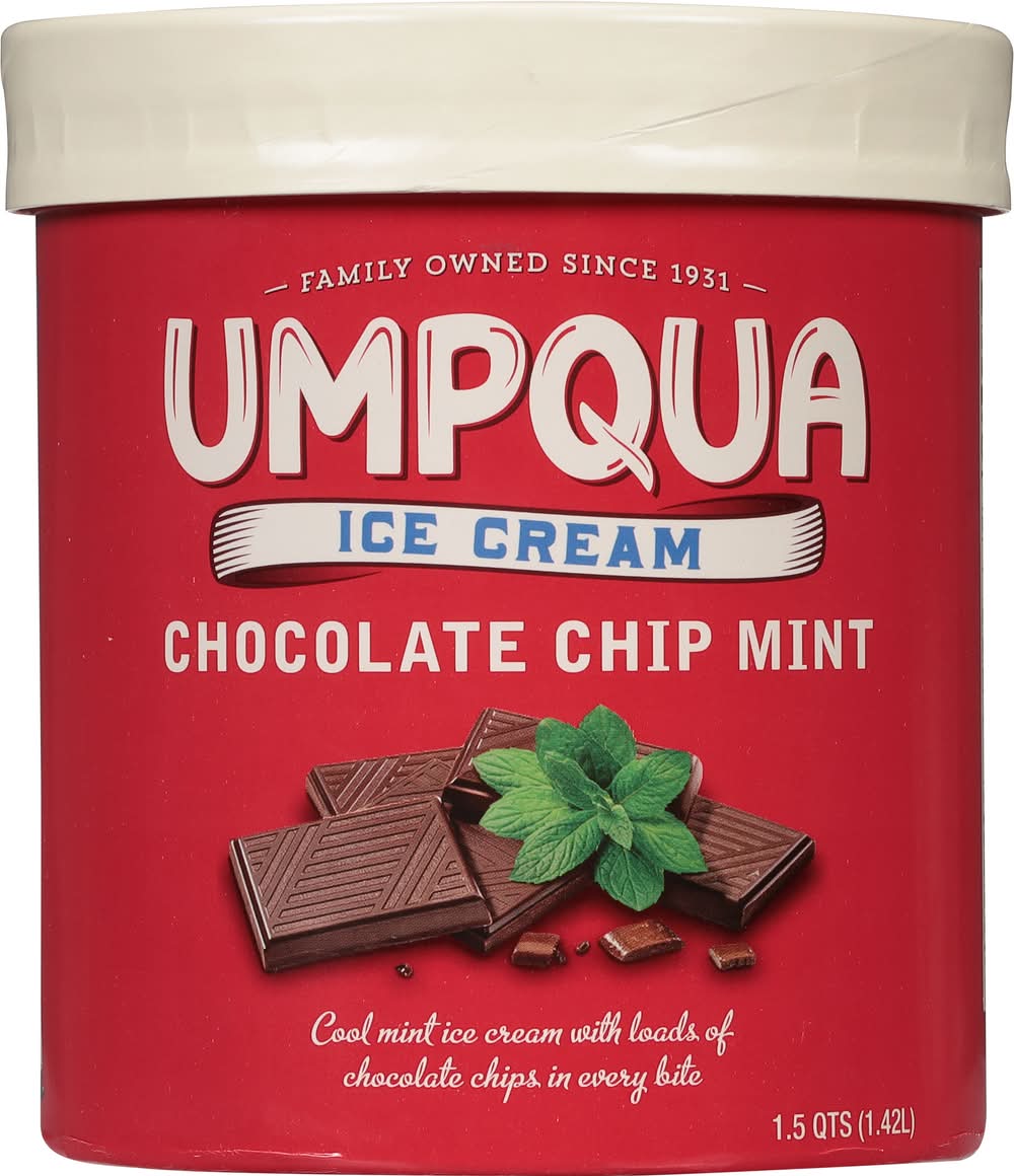 Cool mint ice cream with loads of chocolate chips, in every bite. Family owned since 1931. Ice cream is always a good idea. There's just nothing quite like the pure joy ice cream brings. It's that perfect blend of delicious flavor and creamy sweetness that keeps us all coming back for more. Our family's promise has always been to produce the best quality ice cream using only the freshest cream and finest ingredients. From the beautiful 'Land of Umpqua' to your favorite bowl, and from our family to yours, we hope you enjoy the creamy goodness in each and every bite. Thank you for selecting Umpqua. Umpqua means: Thundering waters. Creamy goodness. Family owned. Highest quality. Fond memories. From cows not treated with rBST (According to the FDA no significant difference has been shown between milk derived from rBST treated and non-rBST treated cows). Our chocolate chip mint is cooler than cool. We start with our crisp mint-flavored ice cream and stir in decadent chips of semi-sweet chocolate for a treat that's as refreshing as it is delicious. www.umpquadairy.com. Join our family. Click the code. • Flavor: Chocolate chip mint • Number of servings: 9