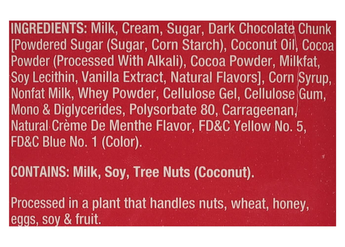 Ingredients: Milk, Cream, Sugar, Dark Chocolate Chunk [Powdered Sugar (Sugar Corn Starch), Coconut Oil, Cocoa Powder (Processed with Alkali), Cocoa Powder, Milkfat, Soy Lecithin, Vanilla Extract, Natural Flavors], Corn (Syrup Nonfat Milk Whey Powder Cellulose Gel Cellulose Gum Mono & Diglycerides Polysorbate 80 Carrageenan Natural Creme De Menthe Flavor FD&C Yellow 5 FD&C Blue 1 (Color) Contains: Milk, Soybeans, Corn, Wheat, Tree Nuts, Eggs, Soybeans