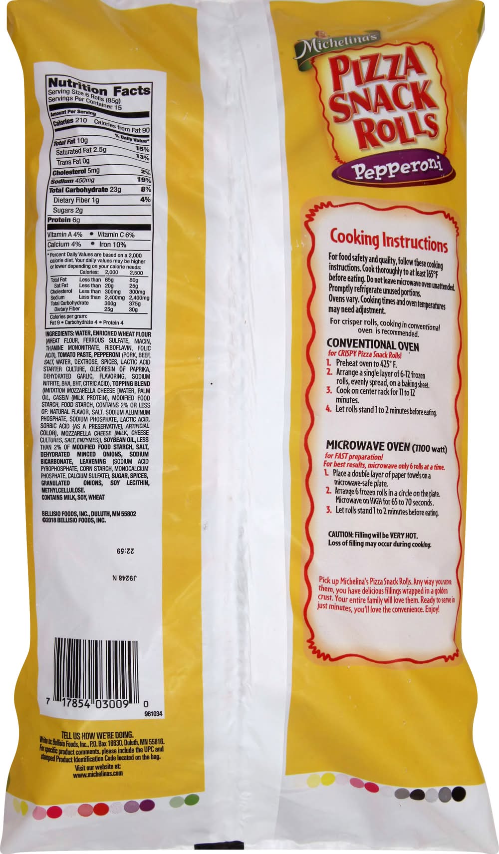 Directions for use: Cook thoroughly. Cooking instructions: for food safety and quality, follow these cooking instructions. Cook thoroughly, at least 165 degrees F before eating. Do not leave microwave oven unattended. Promptly refrigerate unused portions. Ovens vary. Cooking times and oven temperatures may need adjustment. For rolls cooking in conventional oven is recommended. Conventional Oven: for crispy pizza snack rolls! 1. Preheat oven to 425 degrees F. 2. Arrange a single layer of 6-12 frozen rolls, evenly spread, on a baking sheet. 3. Cook on center rack for 11 to 12 minutes. 4. Let rolls stand 1 to 2 minutes before eating. Microwave Oven (1100 watt): for Fast preparation! For best results, microwave only 6 rolls at a time. 1. Place a double layer of paper towels on a microwave-safe plate. 2. Arrange 6 frozen rolls in a circle on the plate. Microwave on high for 65 to 70 seconds. 3. Let rolls stand 1 to 2 minutes before eating. Keep frozen. Storage recommendation: Keep frozen.