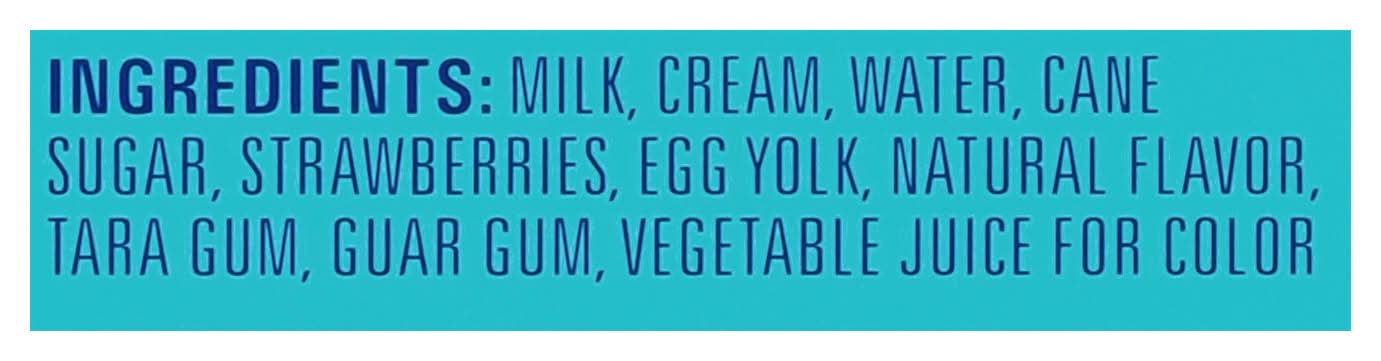 Ingredients: Milk, Cream, Water, Cane Sugar, Strawberries, Egg Yolk, Natural Flavor, Tara Gum, Guar Gum, Vegetable Juice for Color Contains: Milk, Eggs
