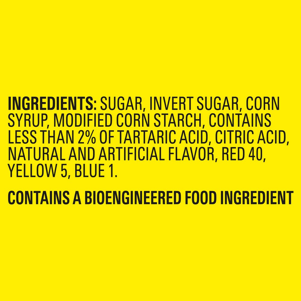 Ingredients: INGREDIENTS: SUGAR, INVERT SUGAR, CORN SYRUP, MODIFIED CORN STARCH, CONTAINS LESS THAN 2% OF TARTARIC ACID, CITRIC ACID, NATURAL AND ARTIFICIAL FLAVOR, RED 40, YELLOW 5, BLUE 1.
