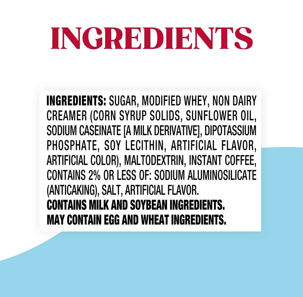 Ingredients: Sugar, Modified Whey, Non Dairy Creamer (Corn Syrup Solids, Sunflower Oil, Sodium Caseinate [A Milk Derivative], Dipotassium Phosphate, Soy Lecithin, Artificial Flavor, Artificial Color), Maltodextrin, Instant Coffee, Contains 2% Or Less Of: Sodium Aluminosilicate (Anticaking), Salt, Artificial Flavor. Contains: Contains Milk and Soybean Ingredients. May Contain Wheat and Egg Ingredients.