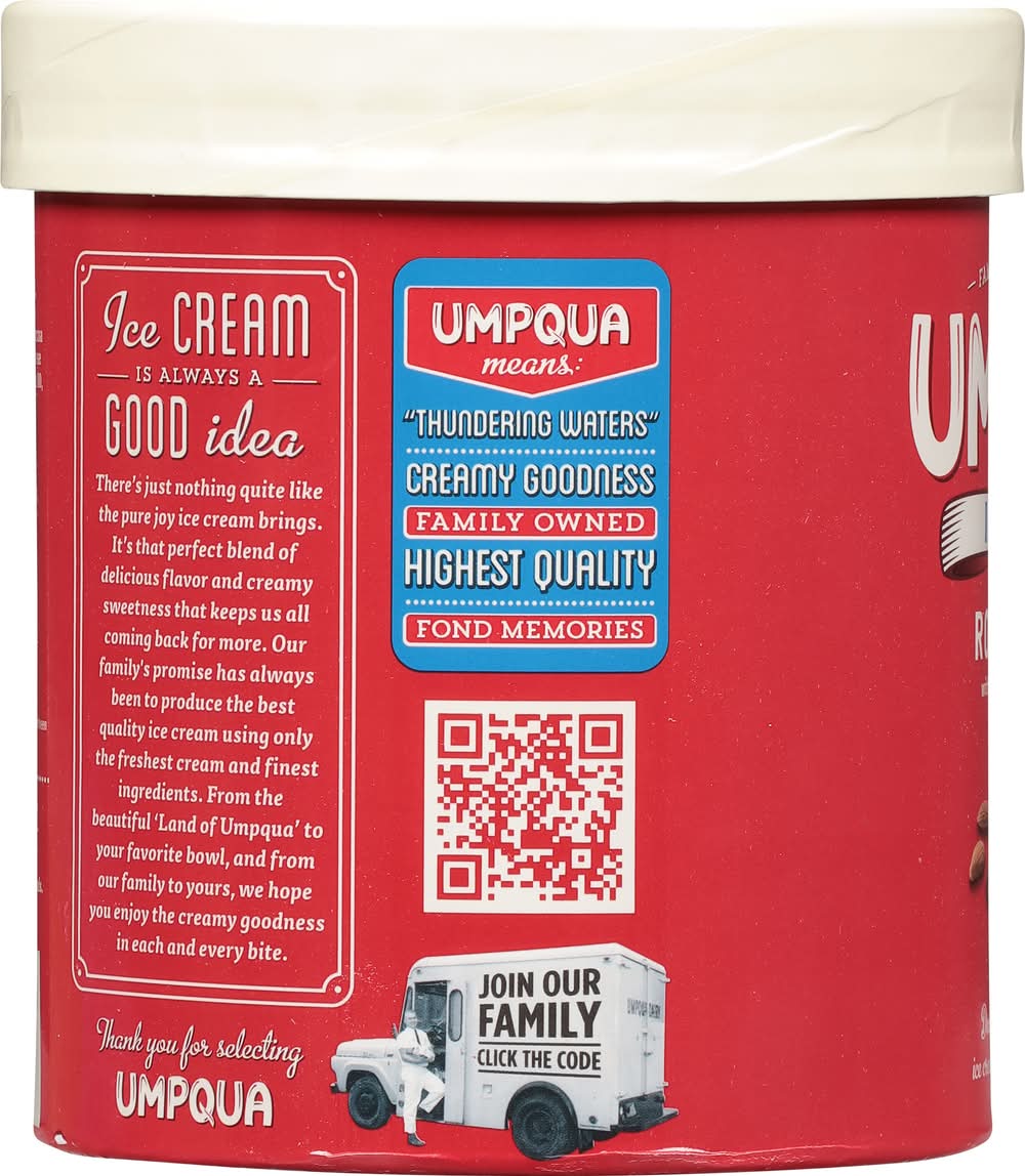 Decadent Dutch chocolate ice cream with mini marshmallows & roasted almond. Rocky road with natural & artificial flavors. Family owned since 1931. From cows not treated with rBST (According to the FDA no significant difference has been shown between milk derived from rBST treated and non-rBST treated cows). This is one rocky road you'll be happy to travel! We blend our decadent Dutch chocolate ice cream with lots of mini marshmallows and reams of roasted almonds. One bite and you'll be a happy camper! Ice cream is always a good idea. There's just nothing quite like the pure joy ice cream brings. It's that perfect blend of delicious flavor and creamy sweetness that keeps us all coming back for more. Our family's promise has always been to produce the best quality ice cream using only the freshest cream and finest ingredients. From the beautiful 'Land of Umpqua' to your favorite bowl, and from our family to yours, we hope you enjoy the creamy goodness in each and every bite. Thank you for selecting Umpqua. Umpqua Means: Thundering waters. Creamy goodness. Family owned. Highest quality. Fond memories. www.umpquadairy.com. Join our family. Click the code. Umpqua Dairy Products Co., Roseburg,OR,97470,USA
