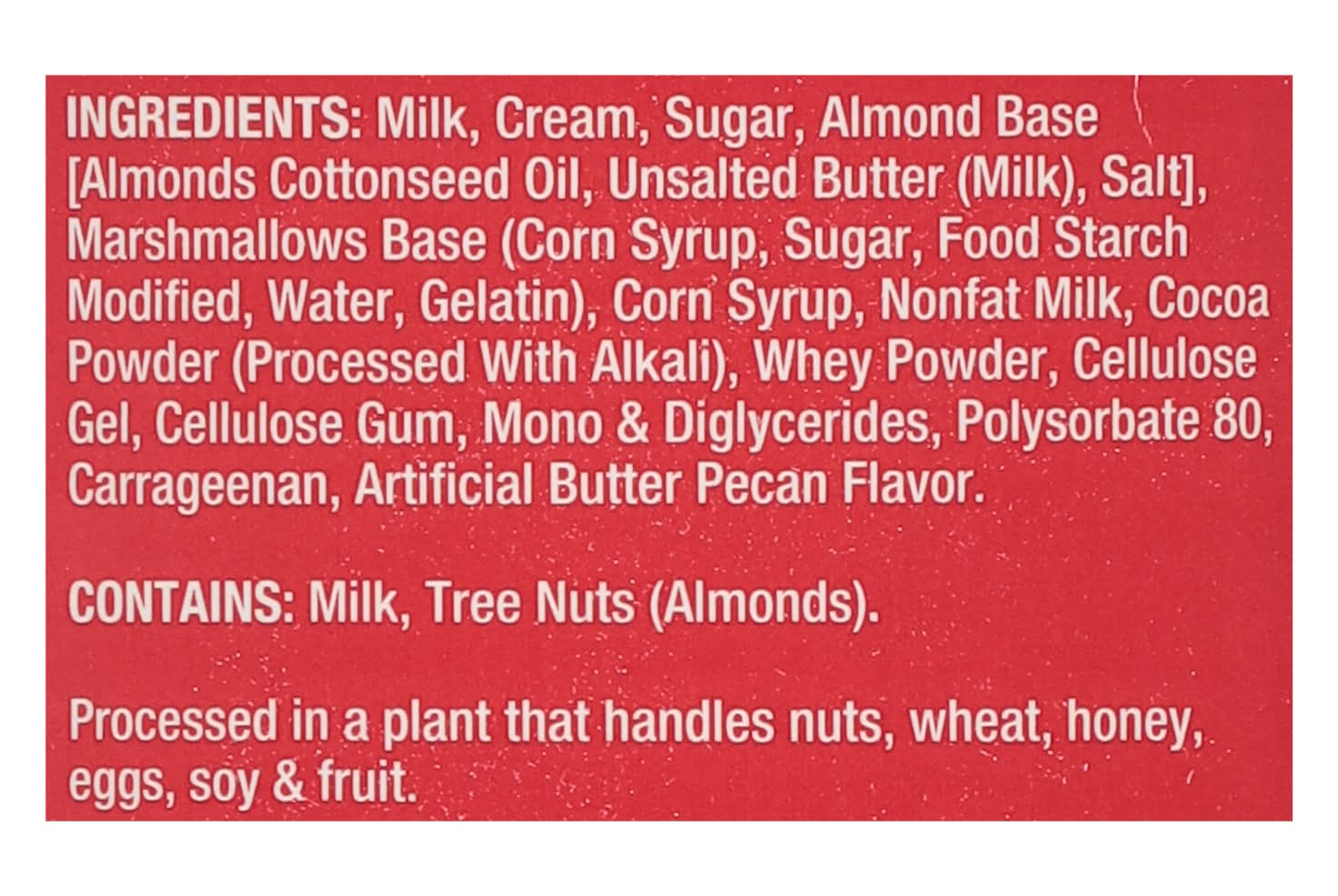 Ingredients: Milk, Cream, Sugar, Almond Base (Almonds Cottonseed Oil Unsalted Butter (Milk), Salt], Marshmallows Base (Corn Syrup Sugar Food Starch Modified Water Gelatin), Corn Syrup, Nonfat Milk, Cocoa Powder (Processed with Alkali), Whey Powder, Cellulose Gel, Cellulose Gum, Mono & Diglycerides, Polysorbate 80, Carrageenan, Artificial Butter Pecan Flavor Contains: Milk, Corn, Wheat, Eggs, Soybeans, Peanuts