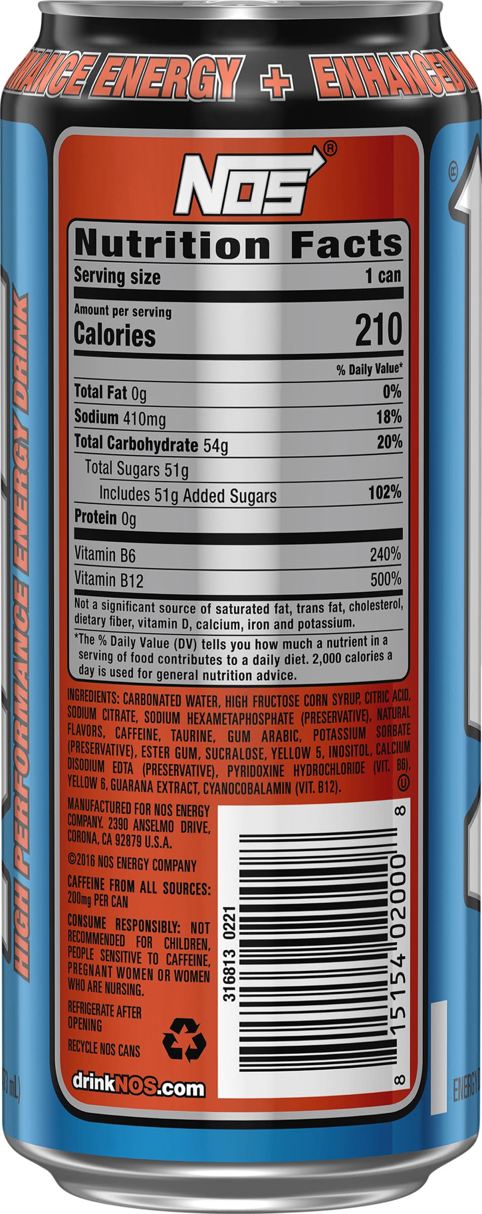 High Performance Energy Drink • NOS Energy, 2390 Anselmo Drive Corona, CA 92879 USA, • Packaging: Reusable