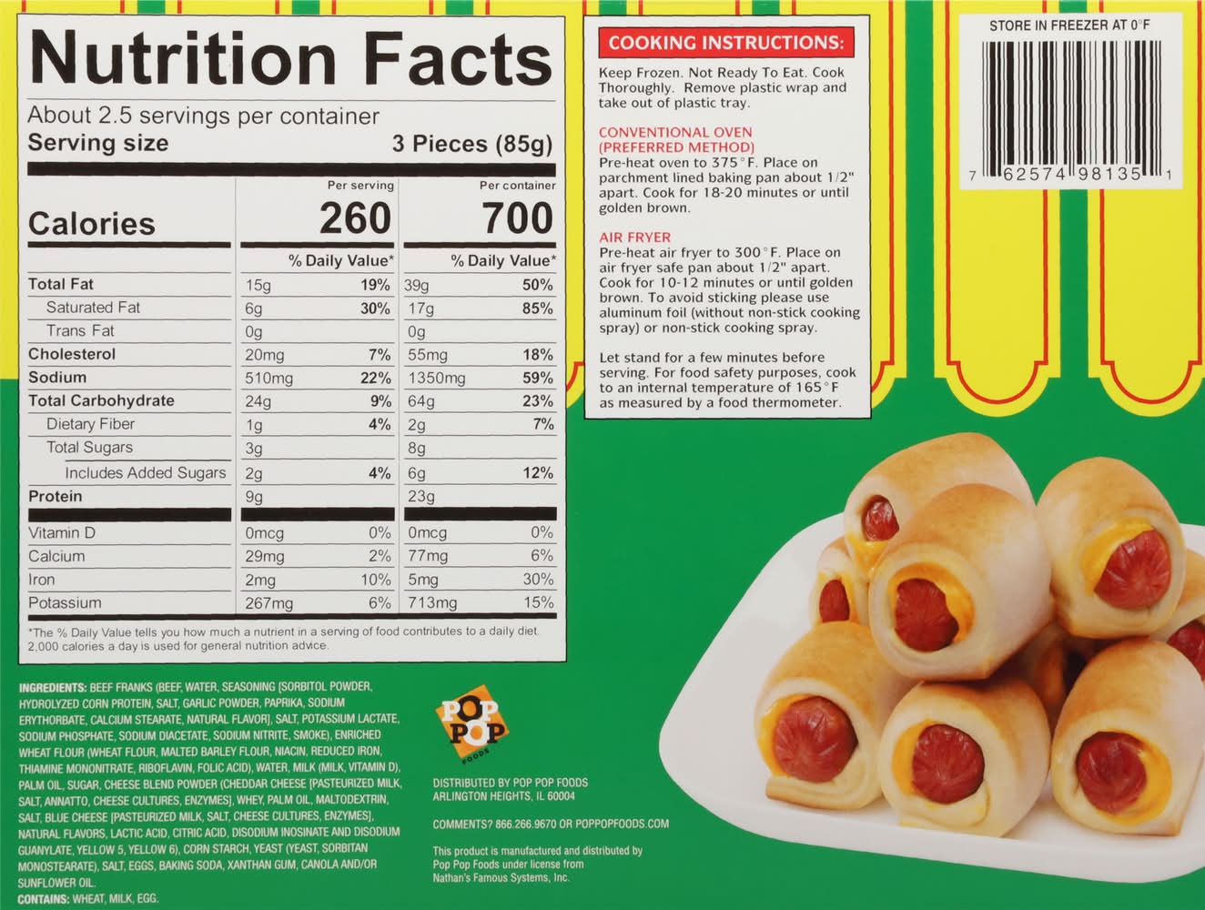 Ingredients: Beef Franks (Beef, Water, Seasoning [Sorbitol Powder, Hydrolyzed Corn Protein, Salt, Garlic Powder, Paprika, Sodium Erythorbate, Calcium Stearate, Natural Flavor], Salt, Potassium Lactate, Sodium Phosphate, Sodium Diacetate, Sodium Nitrite, Smoke), Enriched Wheat Flour (Wheat Flour, Malted Barley Flour, Niacin, Reduced Iron, Thiamine Mononitrate, Riboflavin, Folic Acid), Water, Milk (Milk, Vitamin D), Palm Oil, Sugar, Cheese Blend Powder (Cheddar Cheese [Pasteurized Milk, Salt, Annatto, Cheese Cultures, Enzymes], Whey, Palm Oil, Maltodextrin, Salt, Blue Cheese [Pasteurized Milk, Salt, Cheese Cultures, Enzymes], Natural Flavors, Lactic Acid, Citric Acid, Disodium Inosinate and Disodium Guanylate, Yellow 5, Yellow 6), Corn Starch, Yeast (Yeast, Sorbitan Monostearate), Salt, Eggs, Baking Soda, Xanthan Gum, Canola and/or Sunflower Oil. Contains: Wheat, Milk, Eggs, Corn, Barley
