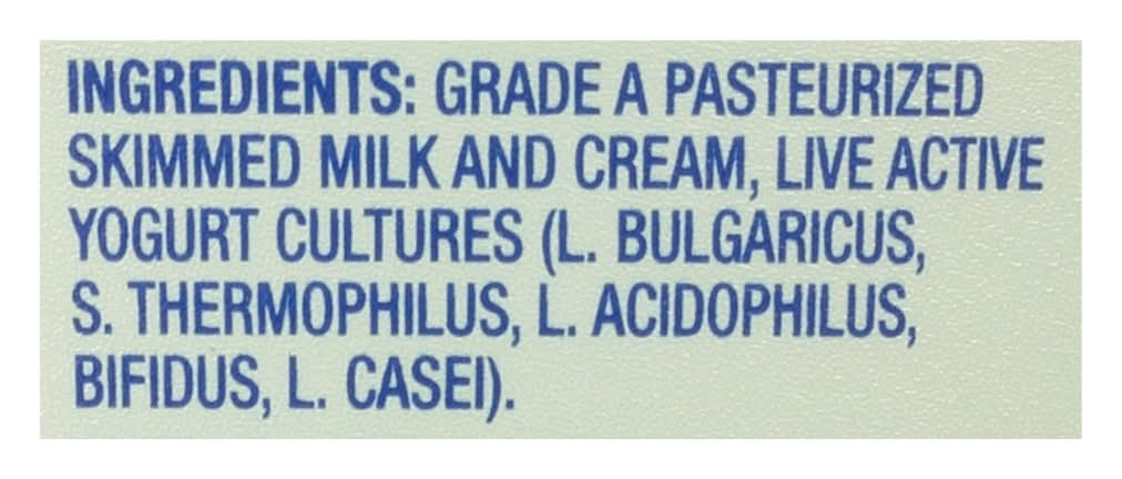 Ingredients: Grade A Pasteurized Skimmed Milk and Cream, Live Active Yogurt Cultures (L. Bulgaricus, S. Thermophilus, L. Acidophilus, Bifidus, L. Casei). Contains: Milk