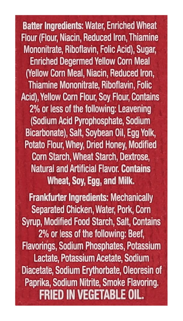 Ingredients: Batter Ingredients: Water, Enriched Wheat Flour (Flour, Niacin, Reduced Iron, Thiamine Mononitrate, Riboflavin, Folic Acid), Sugar, Enriched Degermed Yellow Corn Meal (Yellow Corn Meal, Niacin, Reduced Iron, Thiamine Mononitrate, Riboflavin, Folic Acid), Yellow Corn Flour, Soy Flour, Contains 2% or Less of the Following: Leavening (Sodium Acid Pyrophosphate, Sodium Bicarbonate), Salt, Soybean Oil, Egg Yolk, Potato Flour, Whey, Dried Honey, Modified Corn Starch, Wheat Starch, Dextrose, Natural and Artificial Flavor. Frankfurter Ingredients: Mechanically Separated Chicken, Water, Pork, Corn Syrup, Modified Food Starch, Salt, Contains 2% or Less of the Following: Beef, Flavorings, Sodium Phosphates, Potassium Lactate, Potassium Acetate, Sodium Diacetate, Sodium Erythorbate, Oleoresin of Paprika, Sodium Nitrite, Smoke Flavoring, 2 Contains: Wheat, Soybeans, Eggs, Milk, Corn