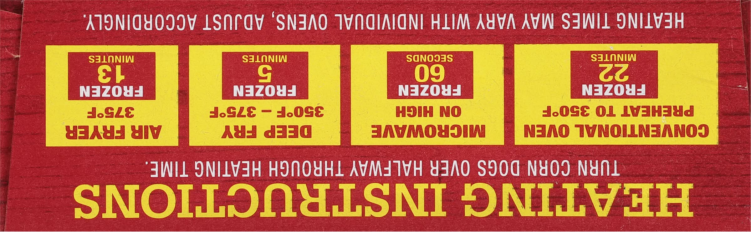 Directions for use: Directions: Air fryer: 375 degree F. Frozen 13 minutes. Heating times may vary with individual ovens, adjust accordingly. Heating Instructions: Turn corn dogs over halfway through heating time. Conventional Oven: Preheat to 350 degree F. Frozen 2 minutes. Microwave on high. Frozen 60 seconds. Deep fry 350 degrees F - 375 degrees F. Frozen 5 minutes. Air fryer 375 degrees F. Frozen 13 minutes. Heating times may vary with individual ovens, adjust accordingly. Keep frozen. Storage recommendation: Keep frozen.