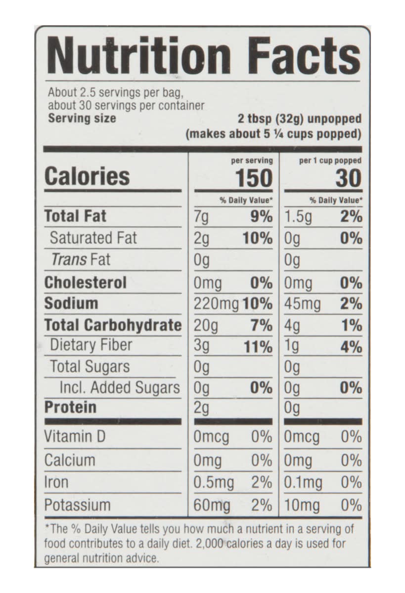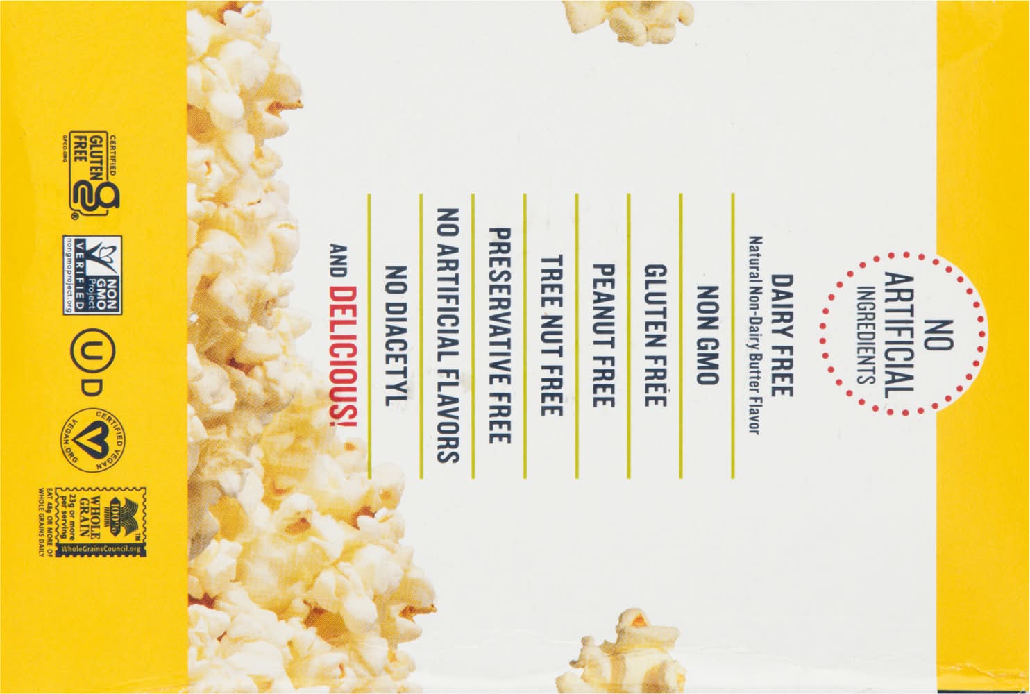 Ingredients: Popcorn, Sunflower Oil, Palm Oil, Sea Salt, Natural Non-Dairy Butter Flavor and Lactic Acid (for Flavor) Contains: Corn