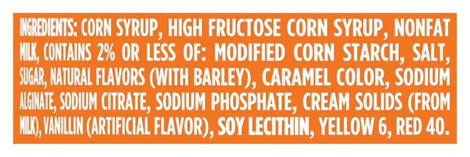 Ingredients: Corn Syrup, High Fructose Corn Syrup, Nonfat Milk, Contains 2% or Less of: Modified Corn Starch, Salt, Sugar, Natural Flavors (with Barley), Caramel Color, Sodium Alginate, Sodium Citrate, Sodium Phosphate, Cream Solids (from Milk), Vanillin (Artificial Flavor), Soy Lecithin, Yellow 6, Red 40