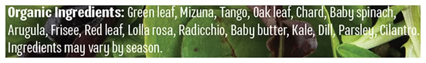 Ingredients: Organic Ingredients: Green Leaf, Mizuna, Tango, Oak Leaf, Chard, Baby Spinach, Arugula, Frisee, Red Leaf, Lolla Rosa, Radicchino, Baby Butter, Kale, Dill, Parsley, Cilantro