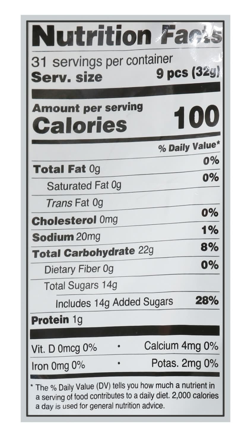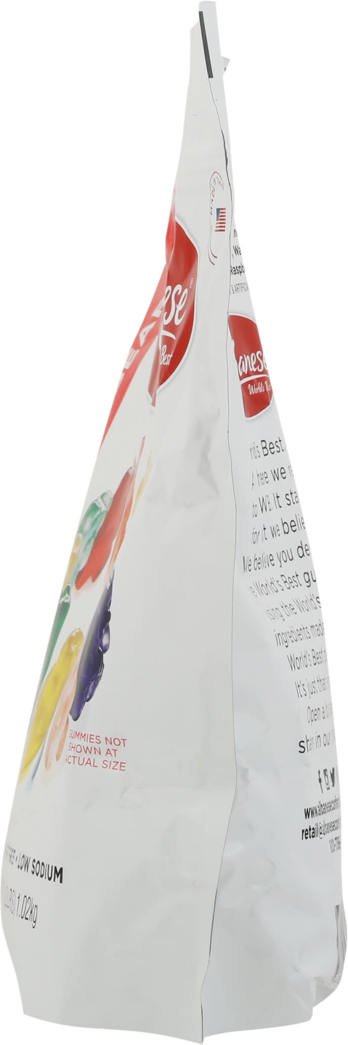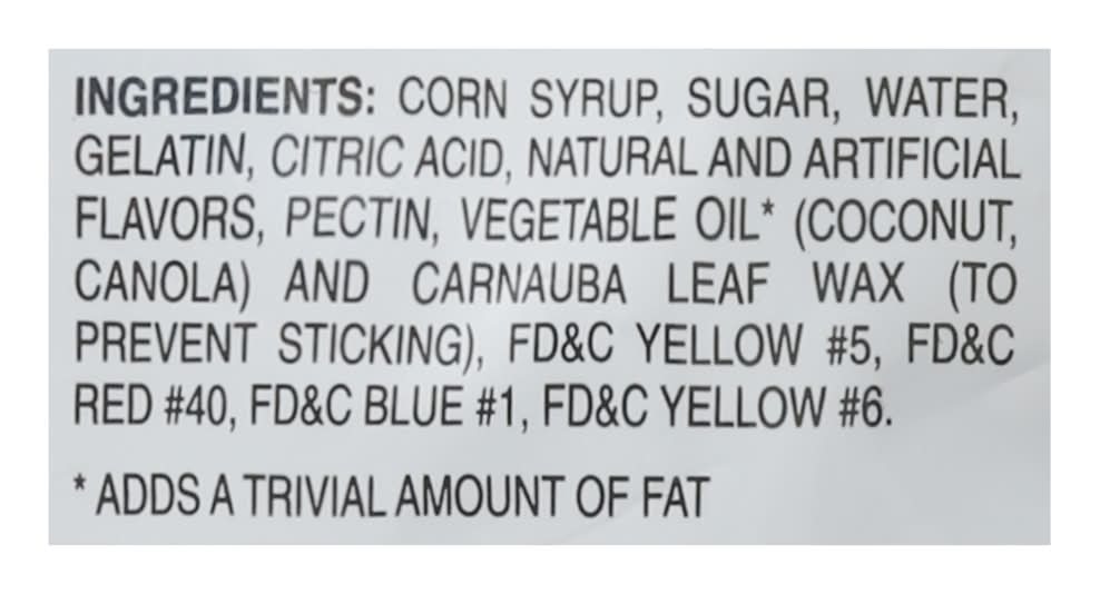 Ingredients: Corn Syrup, Sugar, Water, Gelatin, Citric Acid, Natural and Artificial Flavors, Pectin, Vegetable Oil (Adds a Trivial Amount of Fat) (Coconut, Canola) and Carnauba Leaf Wax (to Prevent Sticking), FD&C Yellow 5, FD&C Red 40, FD&C Blue 1, FD&C Yellow 6 Contains: Corn, Tree Nuts, Coconuts