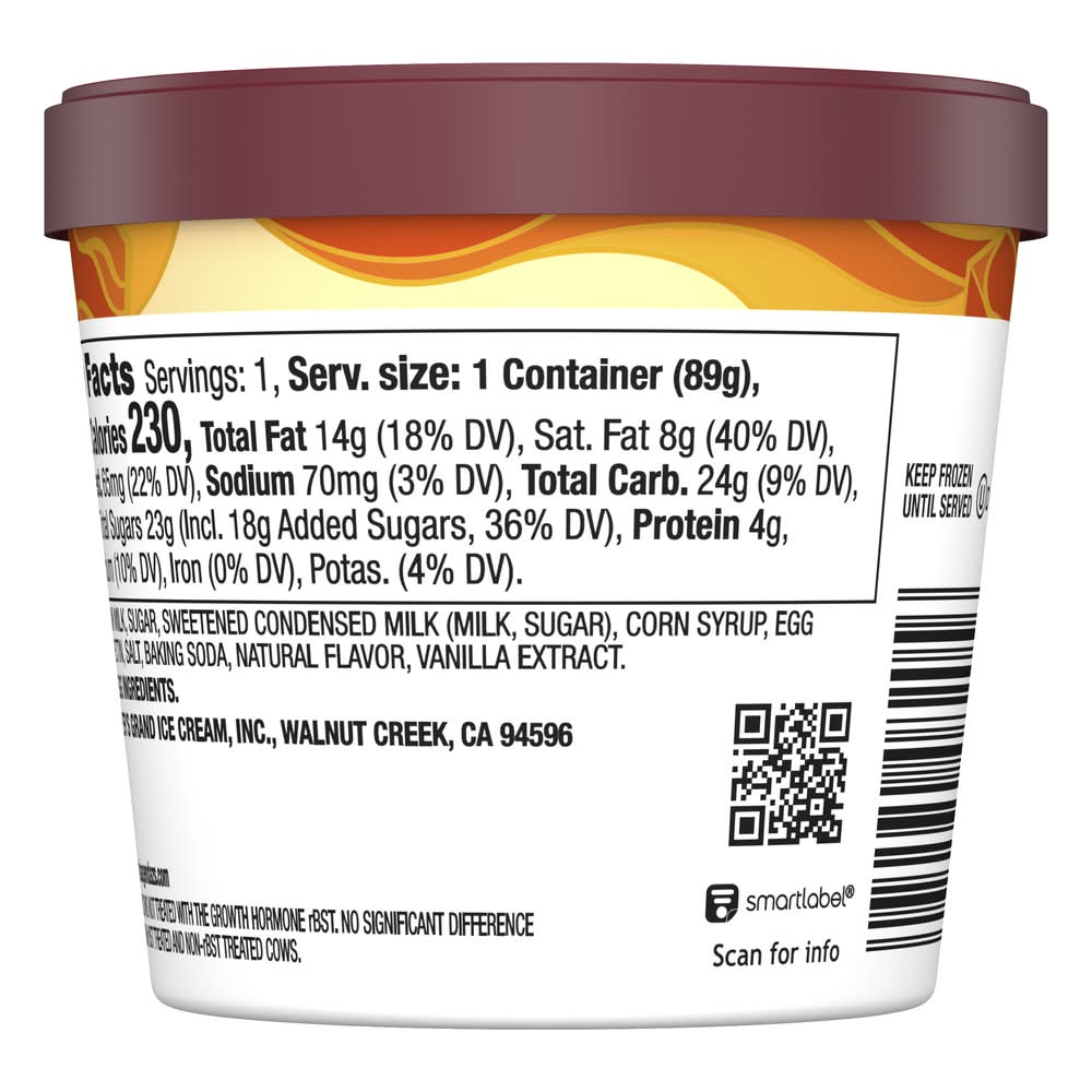 Ingredients: CREAM, SKIM MILK, SUGAR, SWEETENED CONDENSED MILK (MILK, SUGAR), CORN SYRUP, EGG YOLKS, COCONUT OIL, PECTIN, SALT, BAKING SODA, NATURAL FLAVOR, VANILLA EXTRACT. Contains: MILK AND EGG INGREDIENTS.