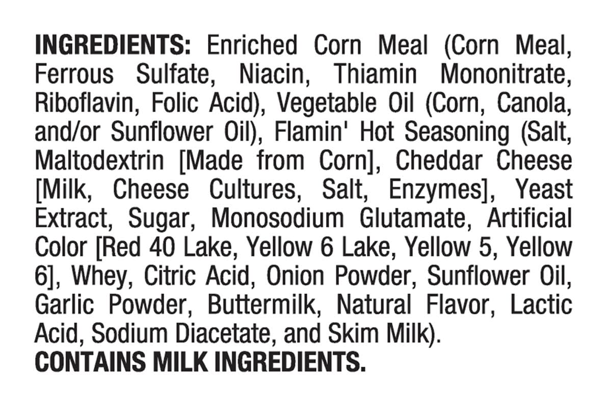 Ingredients: Enriched Corn Meal (Corn Meal, Ferrous Sulfate, Niacin, Thiamin Mononitrate, Riboflavin, Folic Acid), Vegetable Oil (Corn, Canola, and/or Sunflower Oil), Flamin' Hot Seasoning (Salt, Maltodextrin [Made from Corn], Cheddar Cheese [Milk, Cheese Cultures, Salt, Enzymes], Yeast Extract, Sugar, Monosodium Glutamate, Artificial Color [Red 40 Lake, Yellow 6 Lake, Yellow 5, Yellow 6], Whey, Citric Acid, Onion Powder, Sunflower Oil, Garlic Powder, Buttermilk, Natural Flavor, Lactic Acid, Sodium Diacetate, and Skim Milk) Contains: Milk, Corn