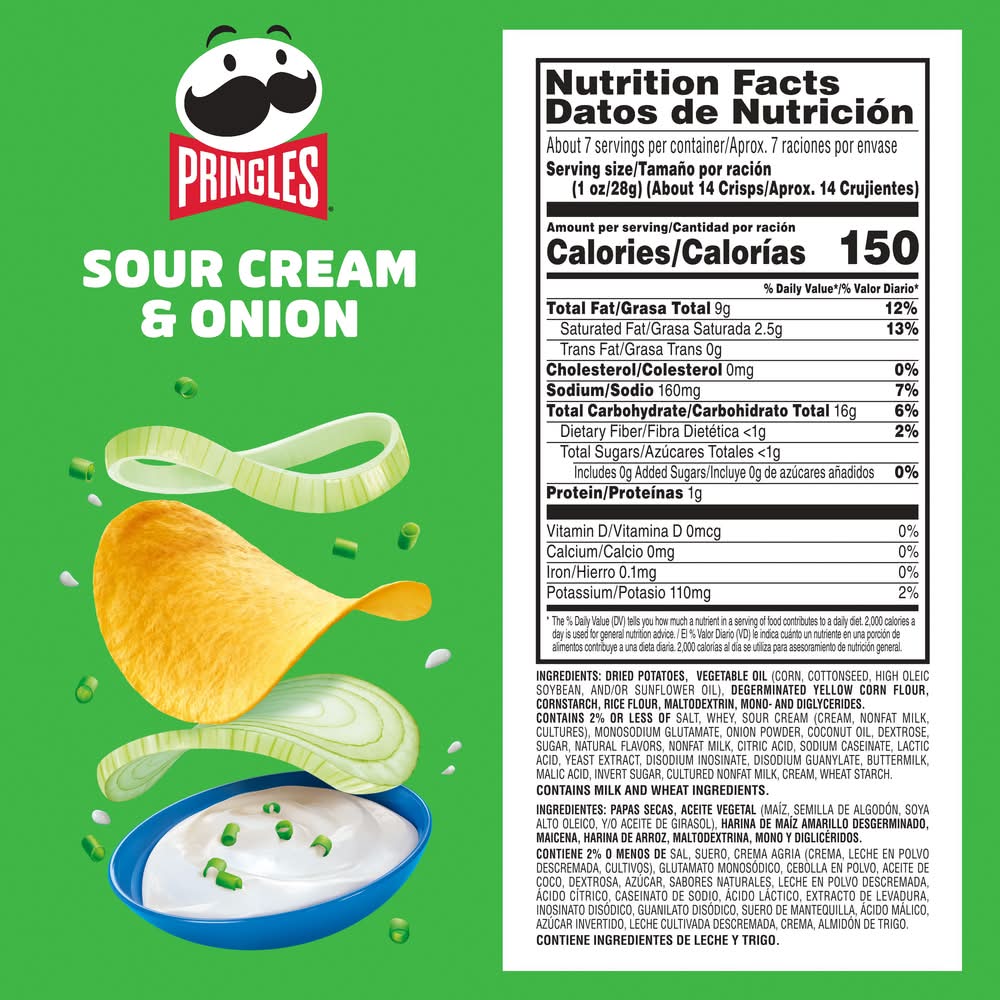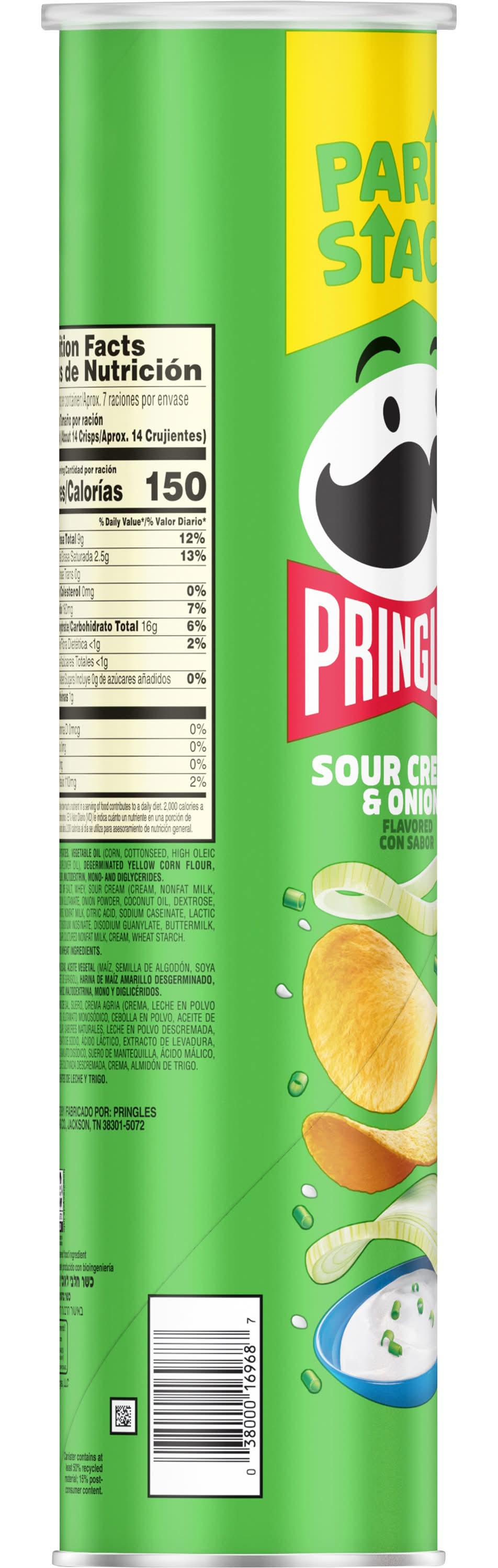 What comes next after the “pop” of a Pringles Sour Cream and Onion Party Stack can? The crisp, crunchy, hit-the-spot taste of potato seasoned with zesty sour cream and onion. Ingeniously shaped Pringles Sour Cream and Onion potato crisps are insanely light, crispy, and never greasy. Perfect for sharing, these crisps chips are perfectly salty and bursting with savory flavor. With this convenient, portable can, it’s easy to create your own snacking moments wherever and whenever; Grab a can as a pick-me-up for after school or pack as the ultimate car snack for road trips. Bring these snacks to game time and pack a few for other Pringles fans. Stash this anytime snack in your work desk or pantry to enjoy anytime. Share Pringles at your next cookout or BBQ to turn up the flavor and fun among family and friends. Get your hands on Pringles Sour Cream and Onion potato crisps for an irresistible taste experience that keeps you coming back, stack after stack. • Flavor: Sour cream-onion • Pringles manufacturing co., Jackson, TN, 38301-5072