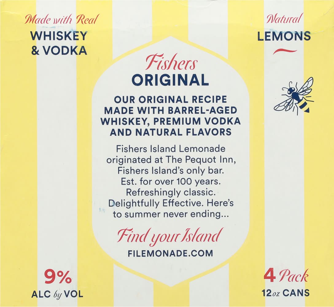 • Brand: Fishers island lemonade • Pack size: 4 • gluten-free • Alcohol by volume: 9% • Flavor: honey, lemon • Tasting notes: citrus, fresh, fruity, honey, silky, smooth • Food pairing: beef, chicken, cured meats, dessert - fruit, fish - white, fruit - citrus, lamb, pasta, pork, shellfish, turkey • Liquor color: yellow/amber