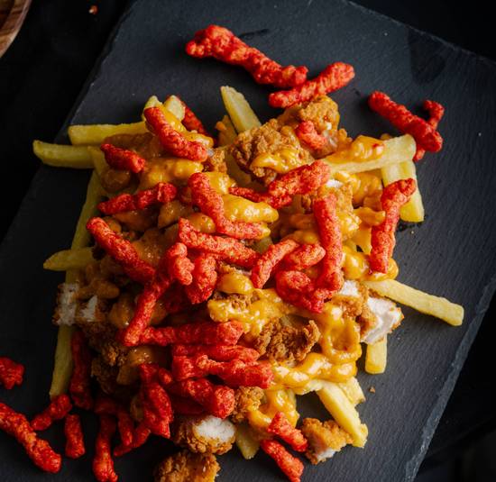 Fries,peri peri salt,chicken strips,and signature sauce topped with cheetos.