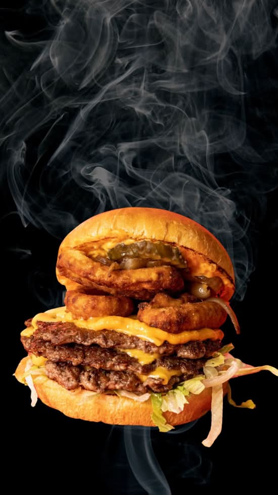 3×2 oz 100% prime beef smash patties, lettuce,cheese,caramelised onions, gherkins and onion rings in a brioche bun.