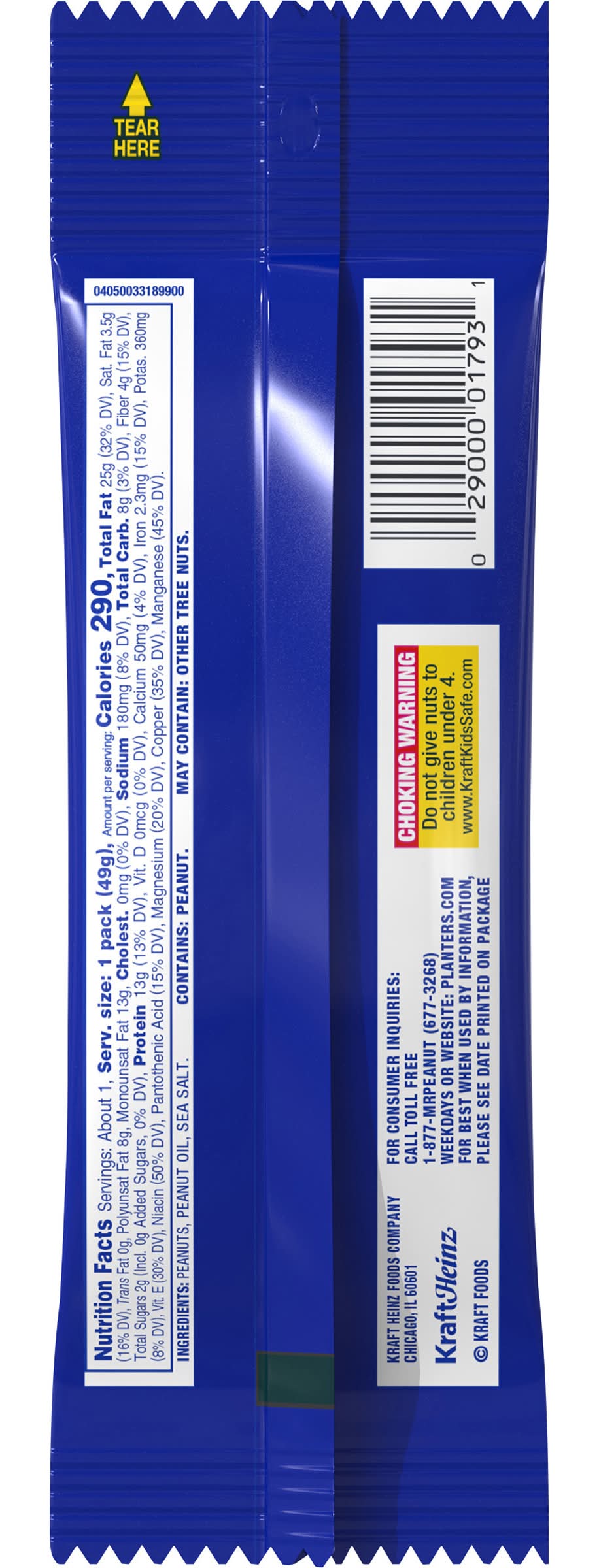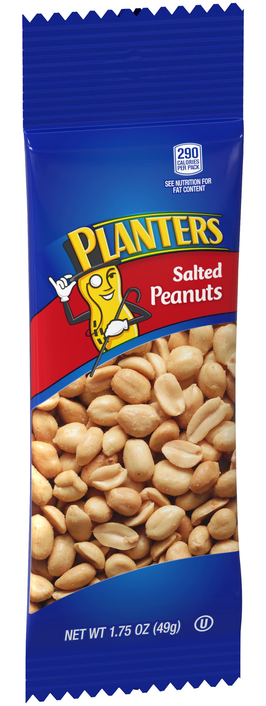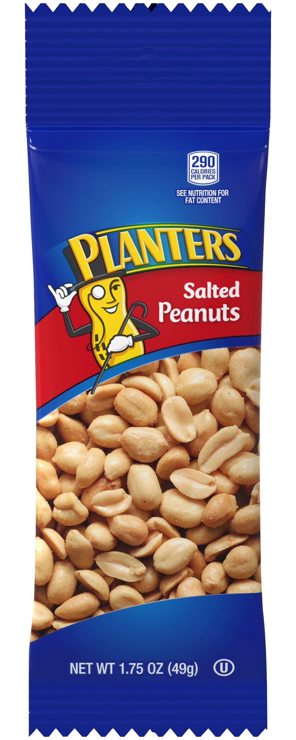 Enjoy a convenient snack with Planters Salted Peanuts, which contain 290 calories per 1.8oz bag. For nutritional details, including fat content, please refer to the information provided on the back of the package.