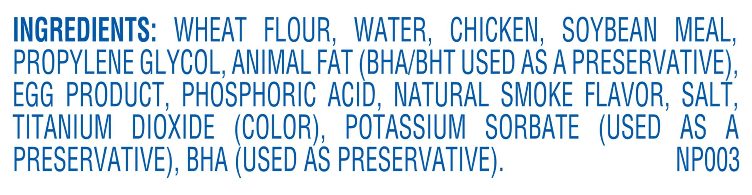 Ingredients: Wheat Flour, Water, Chicken, Soybean Meal, Propylene Glycol, Animal Fat (Bha/BHT Used As A Preservative), Egg Product, Phosphoric Acid, Natural Smoke Flavor, Salt, Titanium Dioxide (Color), Potassium Sorbate (Used As A Preservative), Bha (Used As Preservative) Contains: 'Contains Wheat', 'Contains Soybeans', 'Contains Eggs'