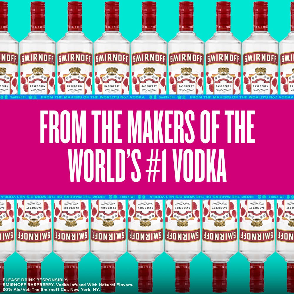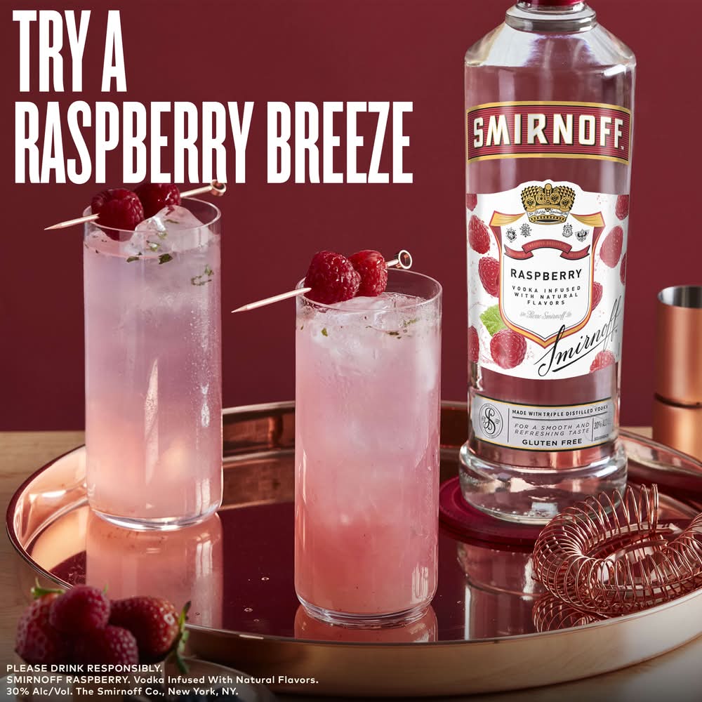 This product is crafted for a smooth taste and aroma, providing a rich berry flavor profile that complements a variety of mixers and cocktails. • Brand: Smirnoff • Flavor: Raspberry • kosher • Alcohol by volume: 30% • Packaging: Reusable