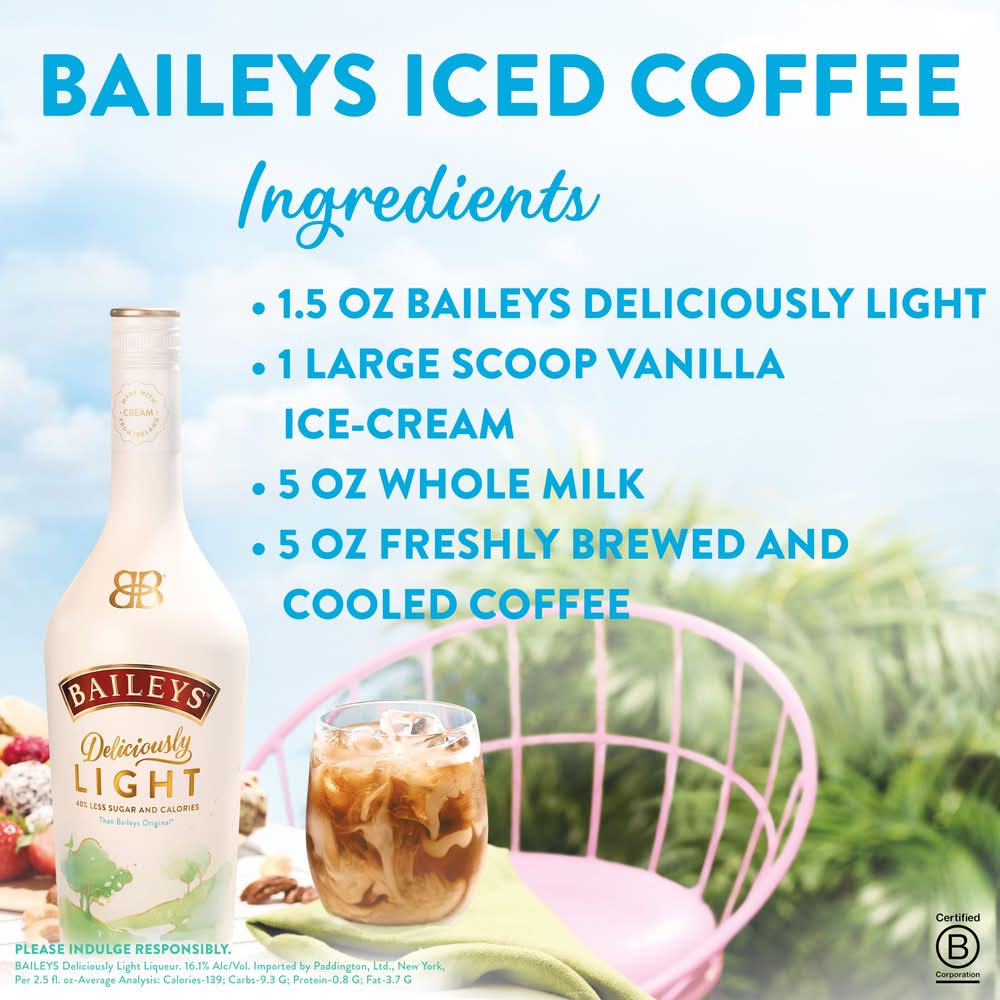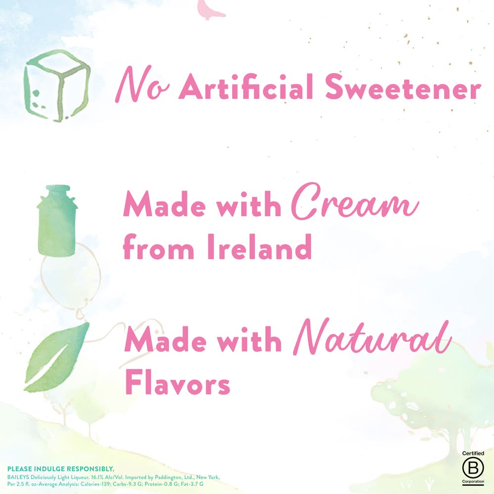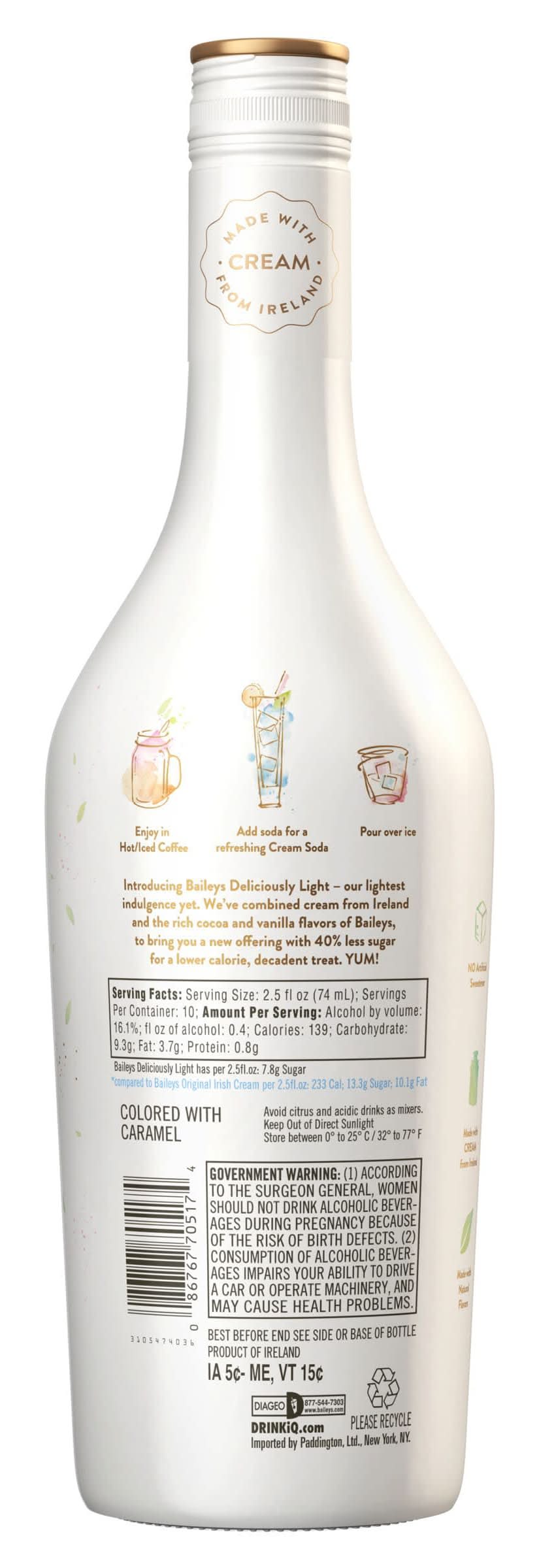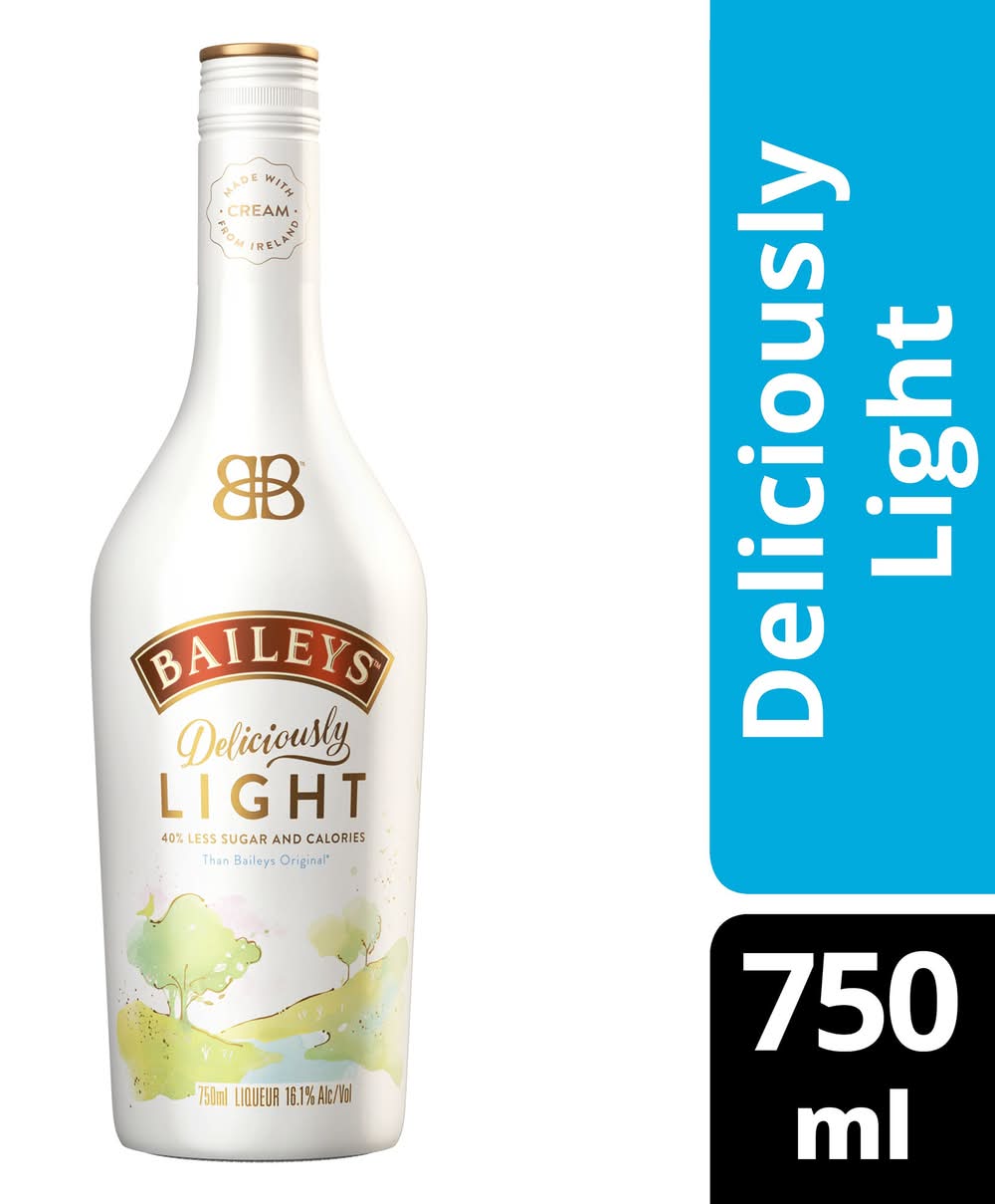Indulge but keep it light with Baileys Deliciously Light. We've combined cream from Ireland and the rich cocoa and vanilla flavors of Baileys to create a sweet treat with 40% fewer calories and 40% fewer grams of sugar than Baileys Original Irish Cream.* Whether you're enjoying a light brunch or a relaxing evening at home, the silky vanilla and rich chocolate flavors of Baileys Deliciously Light are ready to make everyday moments a treat. Looking for a delicious low-calorie dessert option or after-dinner drink? Baileys Deliciously Light is the perfect choice. Includes one 32.2 proof 750 mL bottle of Baileys Deliciously Light. *Per 2.5 fl oz - Average Analysis: Calories - 139; Carbohydrates - 9.3g; Fat - 3.7g. Please enjoy responsibly. • Alcohol by volume: 16.1% • Packaging: Reusable