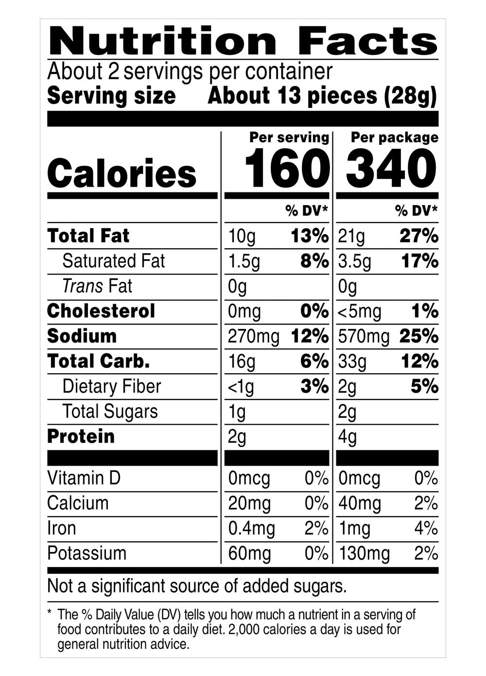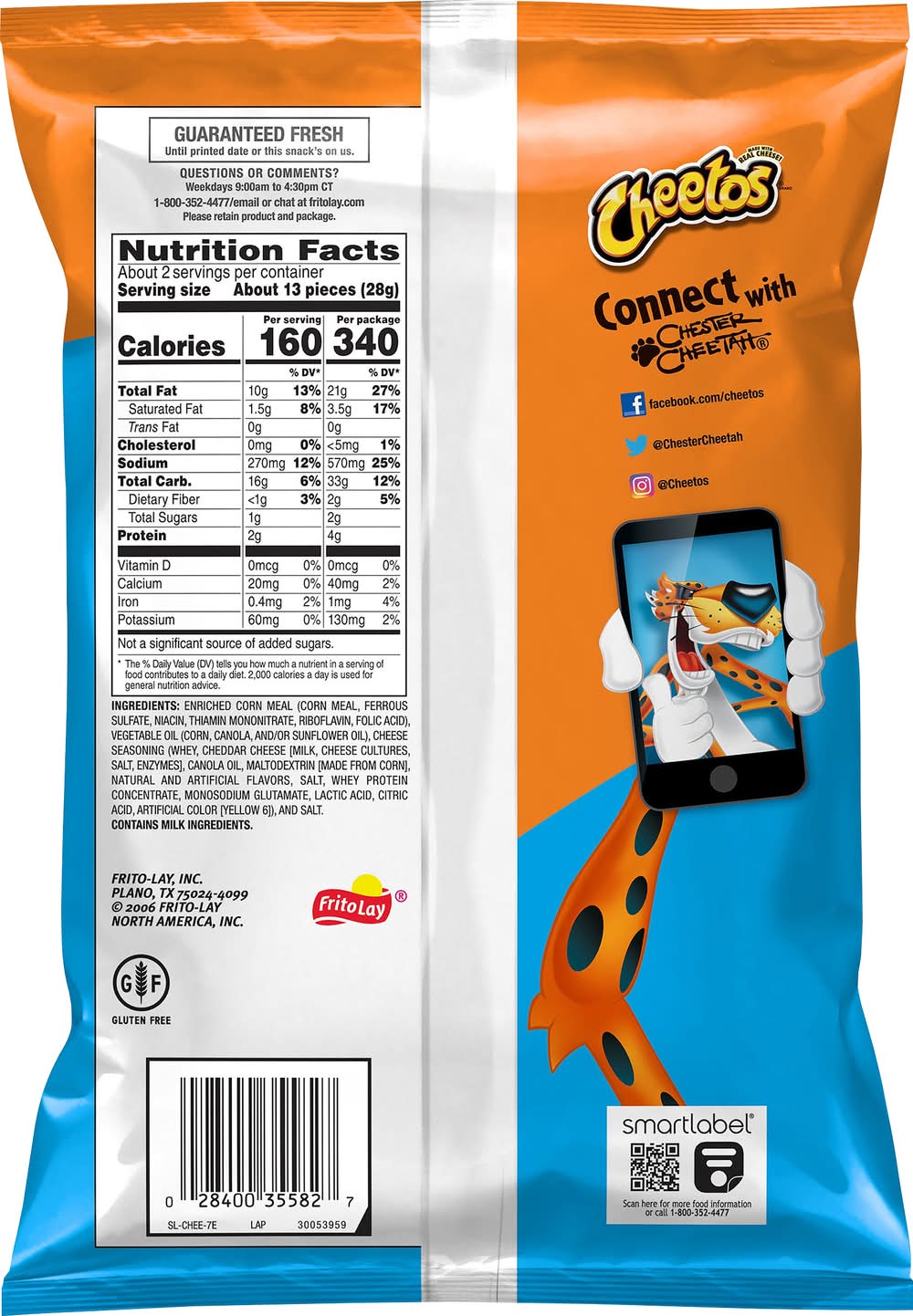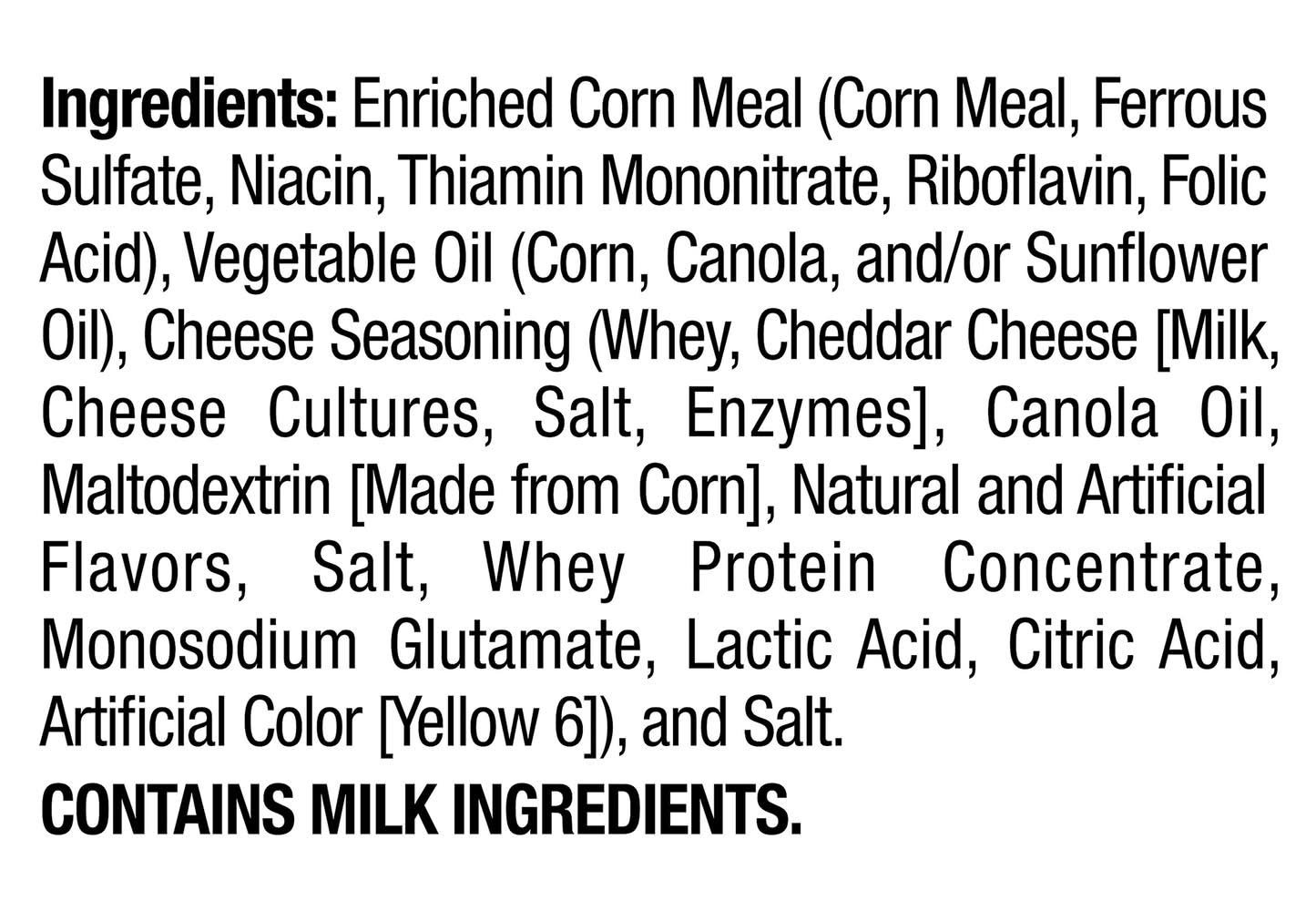 Ingredients: Enriched Corn Meal (Corn Meal, Ferrous Sulfate, Niacin, Thiamin Mononitrate, Riboflavin, Folic Acid), Vegetable Oil (Corn, Canola, and/or Sunflower Oil), Cheese Seasoning (Whey, Cheddar Cheese [Milk, Cheese Cultures, Salt, Enzymes], Canola Oil, Maltodextrin [Made from Corn], Natural and Artificial Flavors, Salt, Whey Protein Concentrate, Monosodium Glutamate, Lactic Acid, Citric Acid, Artificial Color [Yellow 6]), and Salt Contains: Milk, Corn