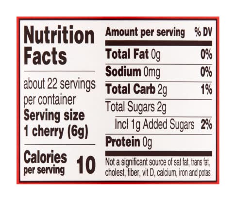 Ingredients: Cherries, Water, Corn Syrup, High Fructose Corn Syrup, Malic Acid, Citric Acid, Natural and Artificial Flavor, Potassium Sorbate and Sodium Benzoate added as Preservative, FD&C Red #4, FD&C Red #3, Sulfur Dioxide (Preservative)