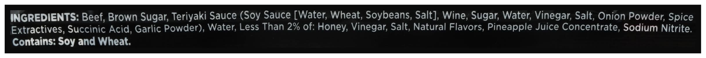 Ingredients: Beef, Brown Sugar, Teriyaki Sauce (Soy Sauce [Water, Wheat, Soybeans, Salt], Wine, Sugar, Water, Vinegar, Salt, Onion Powder, Spice Extractives, Succinic Acid, Garlic Powder), Water, Less than 2% of: Honey, Vinegar, Salt, Natural Flavors, Pineapple Juice Concentrate, Sodium Nitrite Contains: Soybeans, Wheat