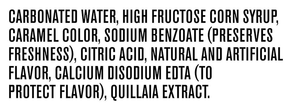 Ingredients: Carbonated Water, High Fructose Corn Syrup, Caramel Color, Sodium Benzoate (Preserves Freshness), Citric Acid, Natural and Artificial Flavor, Calcium Disodium EDTA (to Protect Flavor), Quillaia Extract Contains: Corn