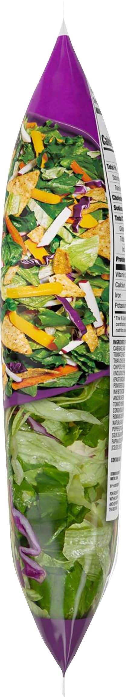 Ingredients: Vegetables: Iceberg, Green Leaf, Carrots, Red Cabbage, Radish. Dressing: Water, Soybean Oil, Sugar, Salt, Onion, Tomato Paste, Cider Vinegar, Distilled Vinegar, Contains Less than 2% of Lime Juice Concentrate, Chipotle Pepper Puree (Water, Chipotle Pepper), Spices, Onion (Dehydrated), Xanthan Gum, Natural Flavors (Includes Soybean, Wheat). Cheese: Cheddar Cheese (Pasteurized Milk, Cheese Culture, Salt, Enzymes, Annato), Powdered Cellulose (to Prevent Caking), Natamycin (a Mold Inhibitor). Tortilla Chips and Strips: Masa Flour, Sunflower and/or Safflower Oil, Nacho Seasoning (Whey, Salt, Lactose Tomato Powder, Buttermilk, Cultured Nonfat Milk, Whey Protein Concentrate, Maltodextrin, Onion Powder, Enzyme Modified Romano Cheese [Pasteurized Cows Milk, Cultures, Salt, Enzymes Natural Flavors, Citric Acid, Lactic Acid, Garlic Powder, Chili Pepper, Extractive of Paprika [Color]), Chili Lime Seasoning (Whey, Sour Cream Powder [Cultured Cream, Nonfat Milk] Salt, Spices, Paprika, (Color) Citric Acid, Lime Flavor, Extractive of Paprika [Color], Spice Extractive) Contains: Milk, Soybeans, Wheat, Lactose