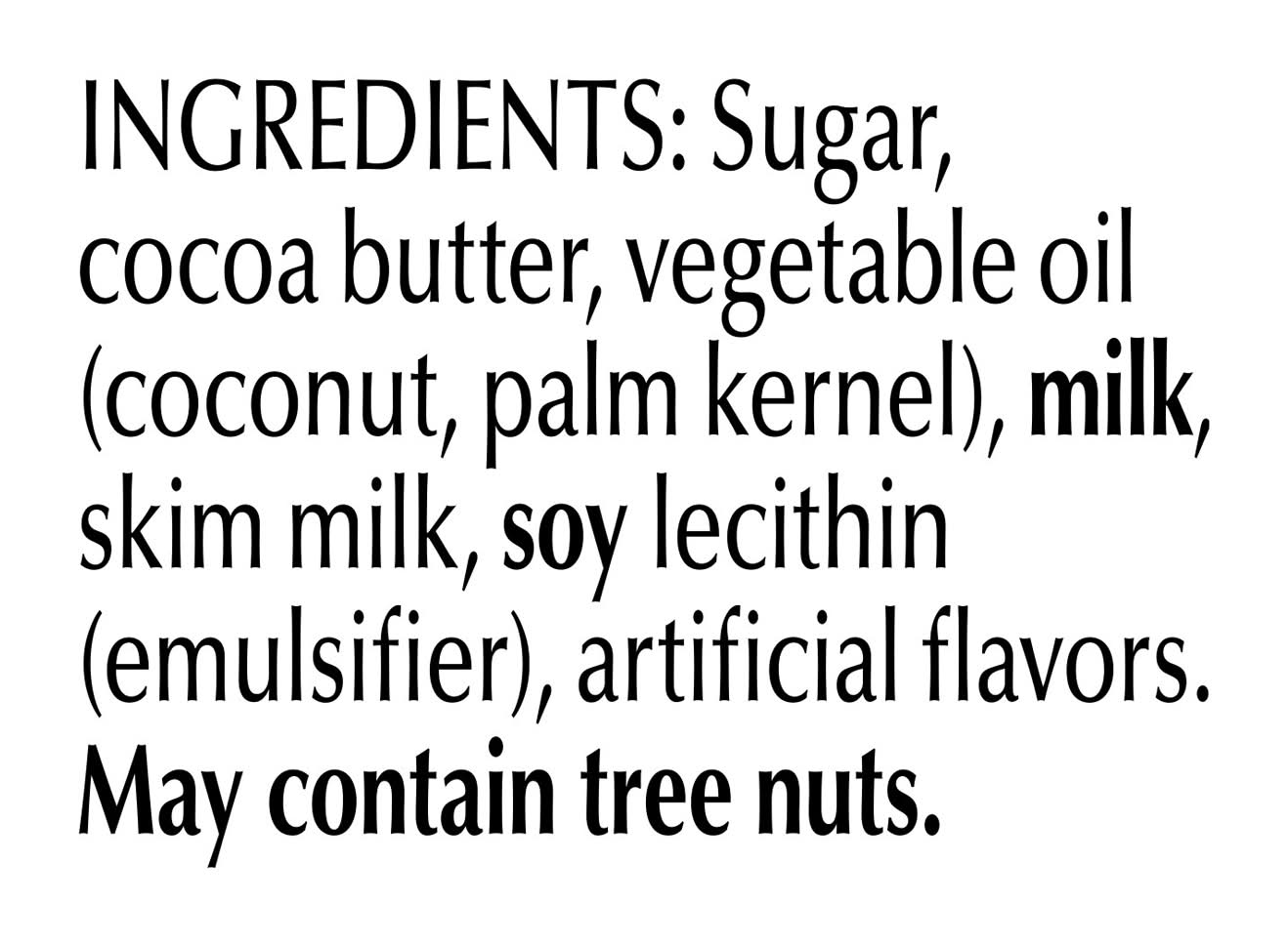 Ingredients: Sugar, Cocoa Butter, Vegetable Oil (Coconut, Palm Kernel), Milk, Skim Milk, Soy Lecithin (Emulsifier), Artificial Flavors Contains: Tree Nuts, Coconuts, Milk, Soybeans, Tree Nuts