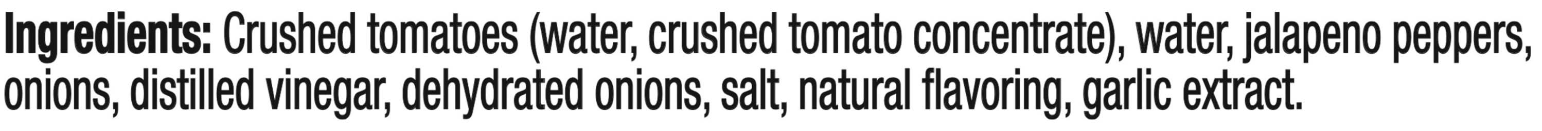 Ingredients: INGREDIENTS: CRUSHED TOMATOES (WATER, CRUSHED TOMATO CONCENTRATE), WATER, JALAPENO PEPPERS, ONIONS, DISTILLED VINEGAR, DEHYDRATED ONIONS, SALT, NATURAL FLAVORING, GARLIC EXTRACT.