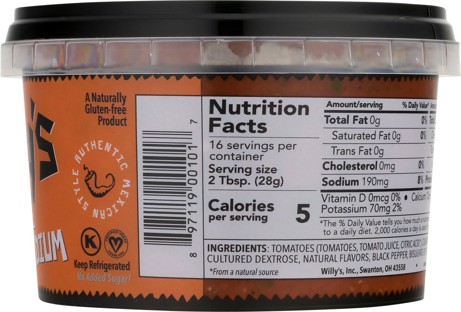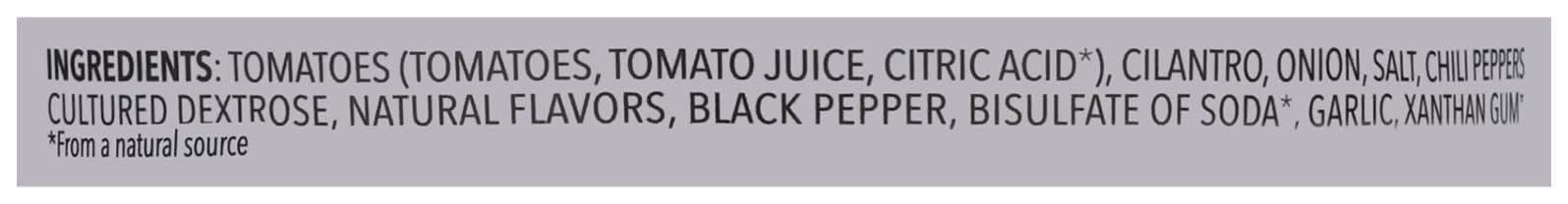 Ingredients: Tomatoes (Tomatoes, Tomato Juice, Citric Acid [from a Natural Source]), Cilantro, Onion, Salt, Chili Peppers, Cultured Dextrose, Natural Flavors, Black Pepper, Bisulfate of Soda (from a Natural Source), Garlic, Xanthan Gum (from a Natural Source)
