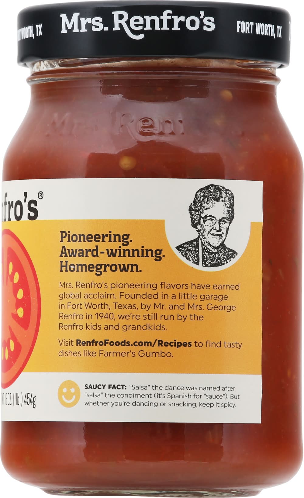 No HFCS. No added sugar. No added sugar. Non GMO Project Verified.Non GMO. Est 1940. Pioneering. Award-winning. Homegrown. Mrs. Remfro pioneering flavors have earned global acclaim. Founded in a little garage in Fort Worth, TX, Texas, by Mr. and Mr. George Renfro in 1940, we’re still run by the Renfro kids and grandkids. Saucy Fact: "Salsa" the dance was named after "salsa" the condiment (it's Spanish for "sauce"). But whether you're dancing or snacking, keep it spicy. No HFCS. Recipes o find tasty dishes like Farmer’s Gumbo.